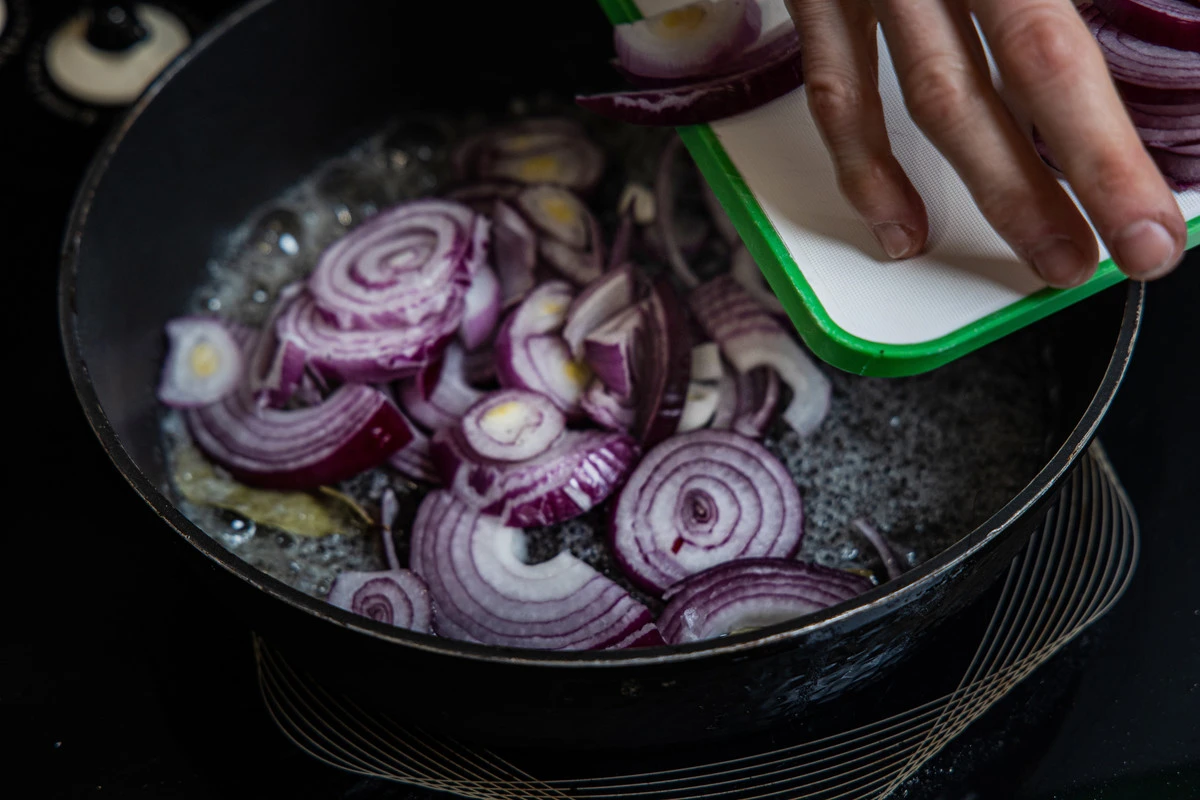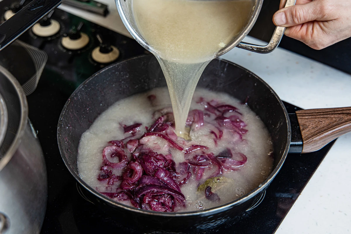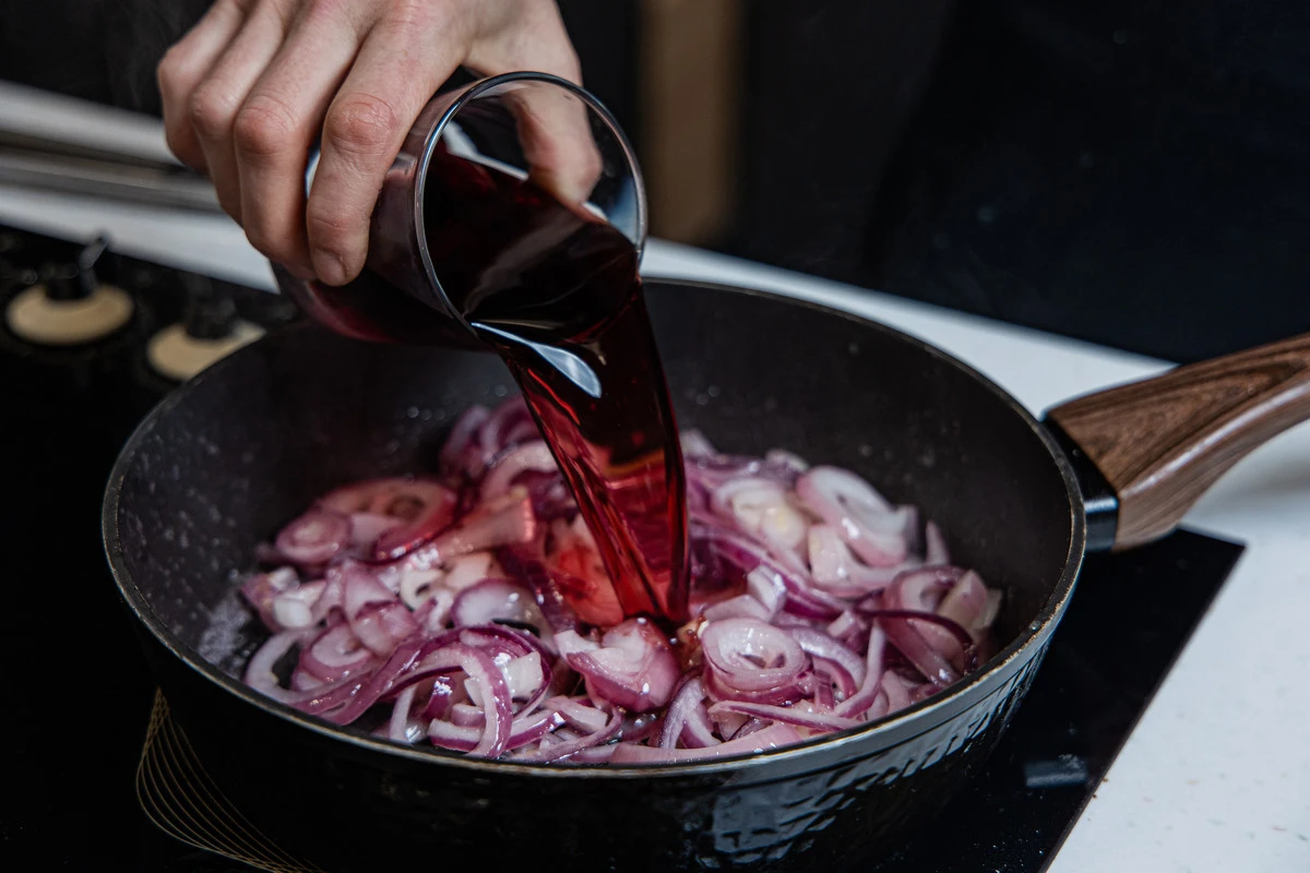 Влейте стакан вина к луку и выпарьте на сильном огне.
