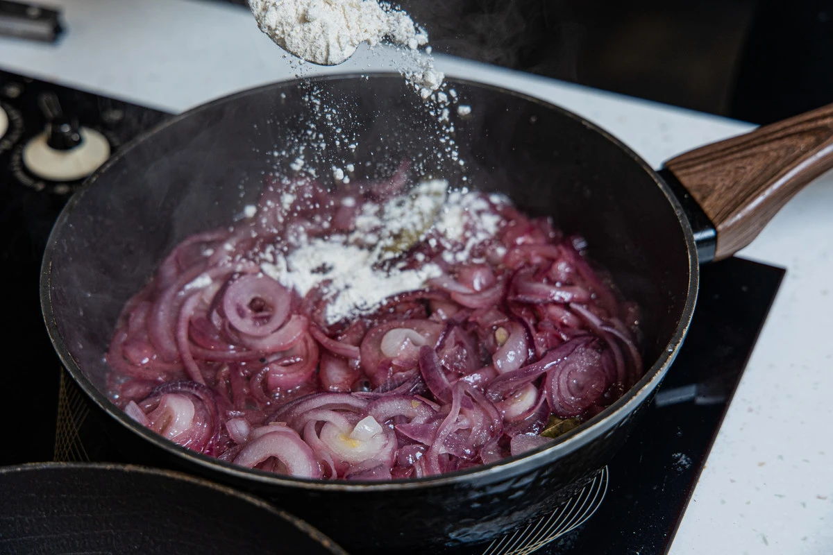 В конце убавьте огонь и всыпьте столовую ложку муки.