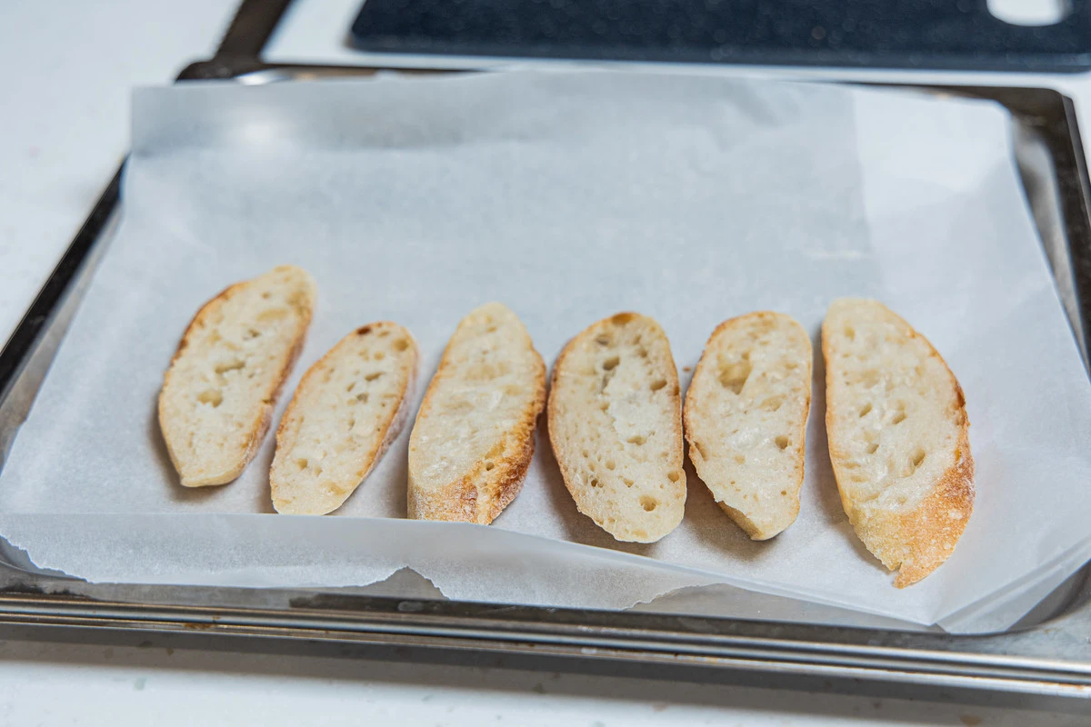 Багет нарежьте кусочками, выложите на противень, застеленный пергаментом.