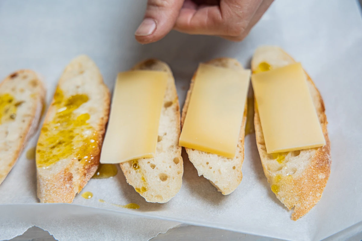 Каждый кусочек смажьте оливковым маслом, сверху положите по ломтику сыра и запеките при 180 °C до расплавления сыра.