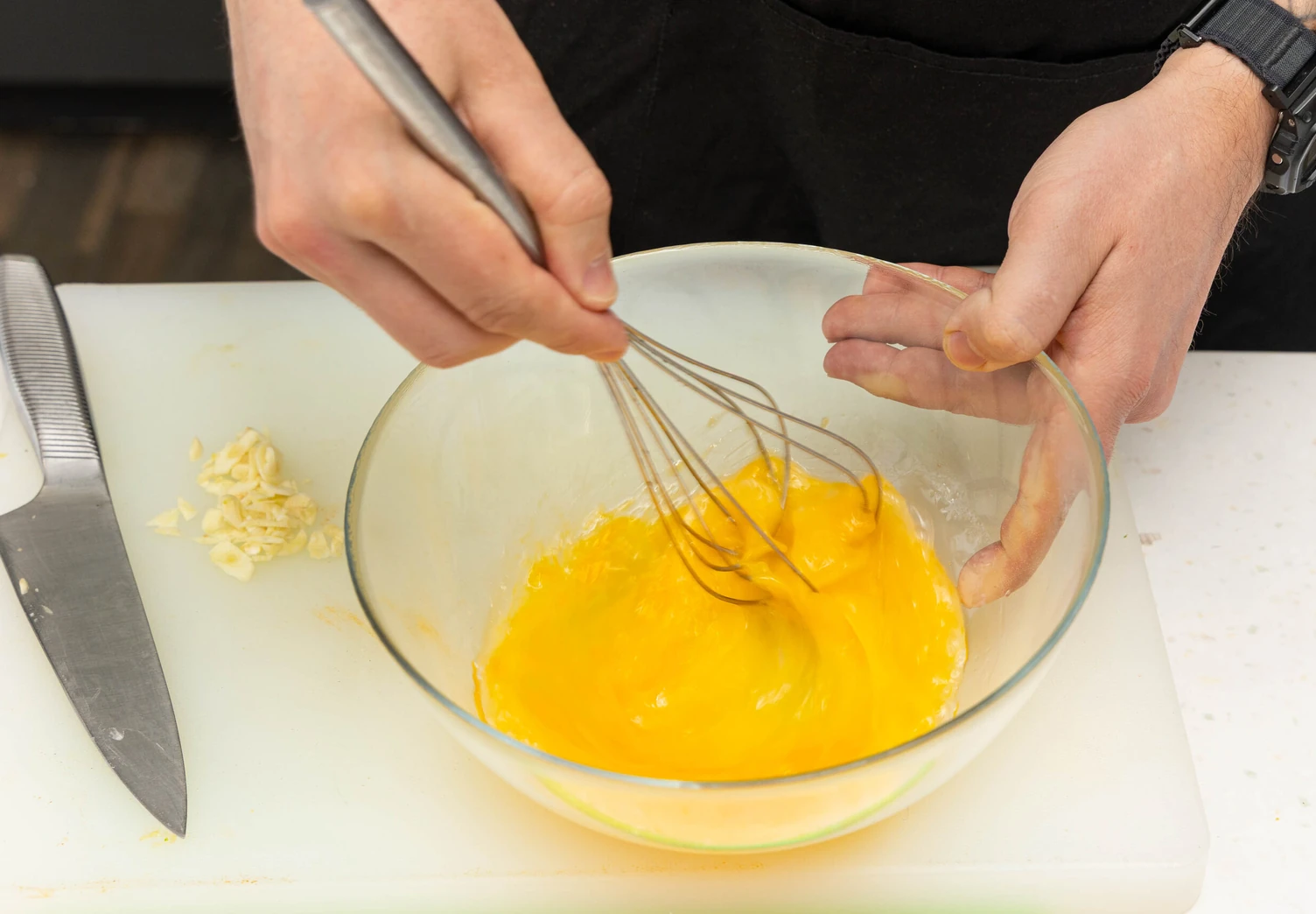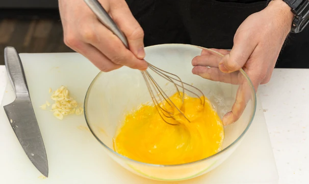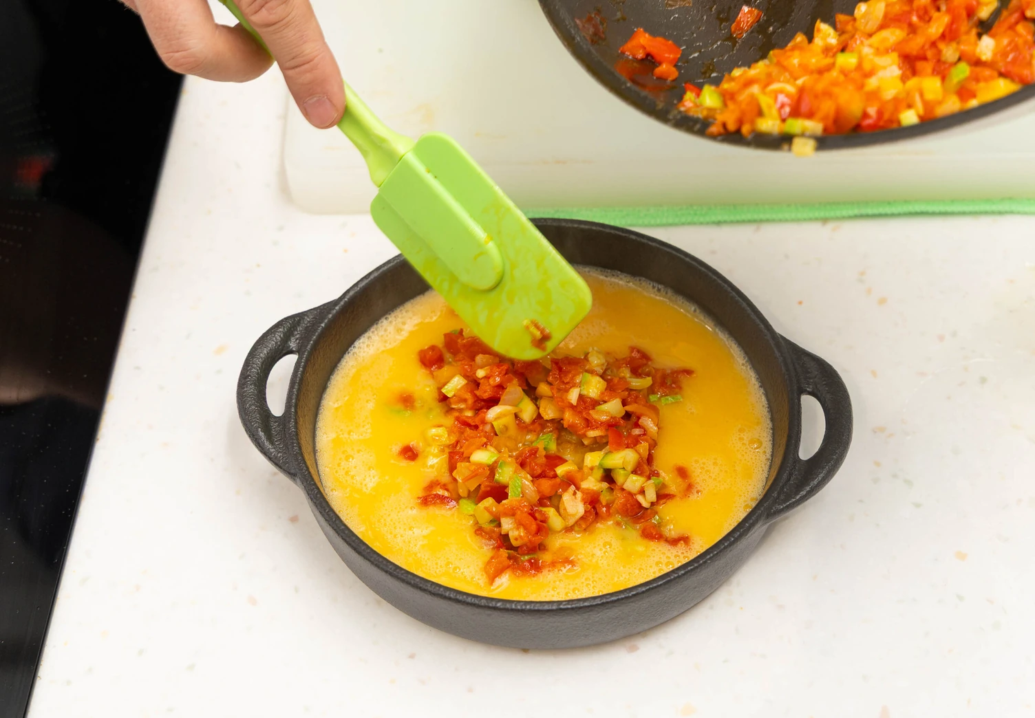 В ёмкость для запекания, смазанную маслом, вылейте яйца, добавьте обжаренные овощи, и запекайте в духовке, разогретой до 180 °C, до готовности.