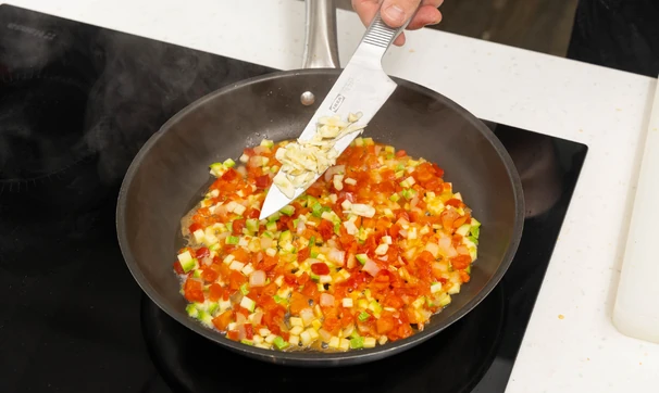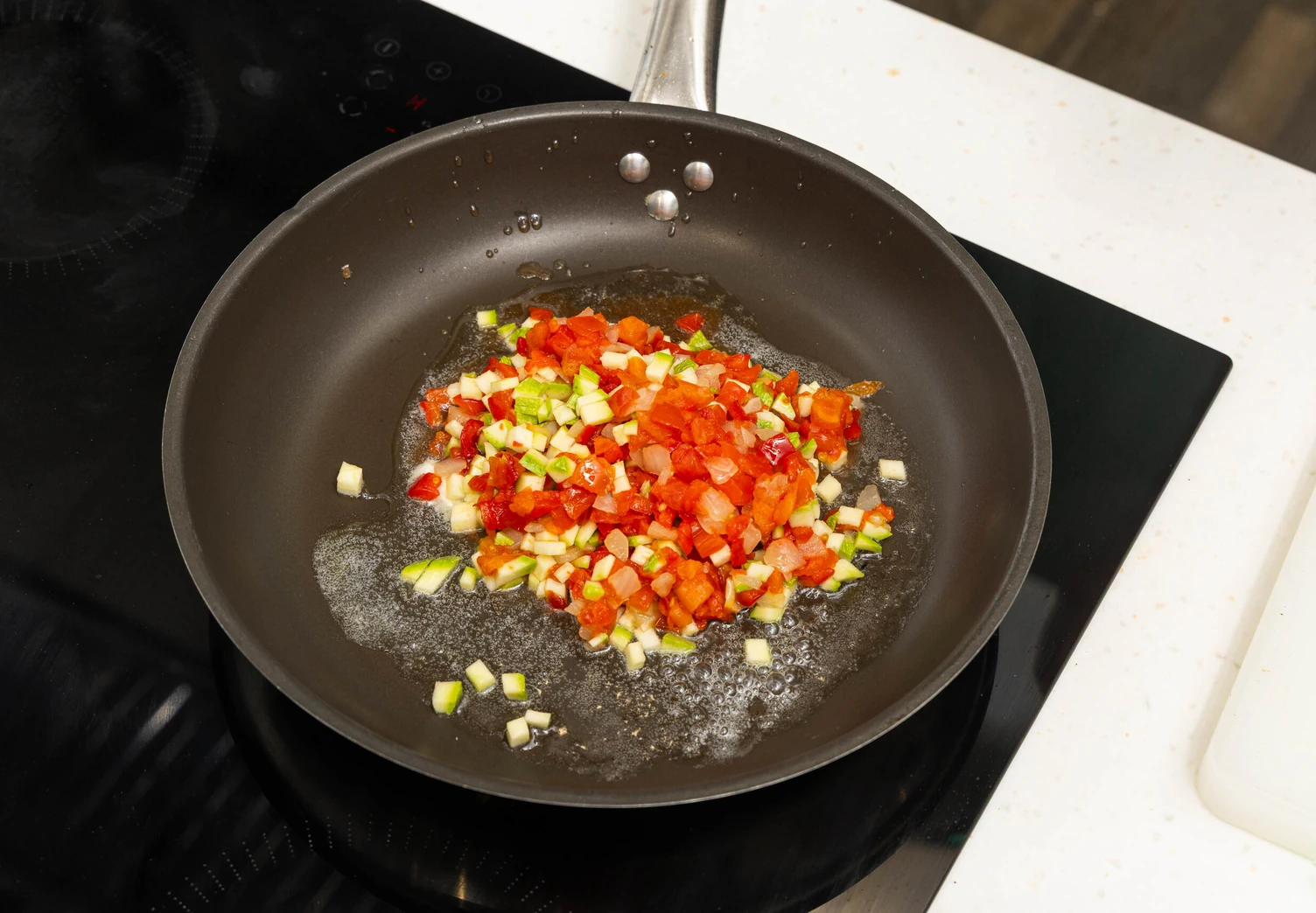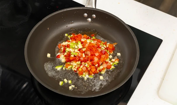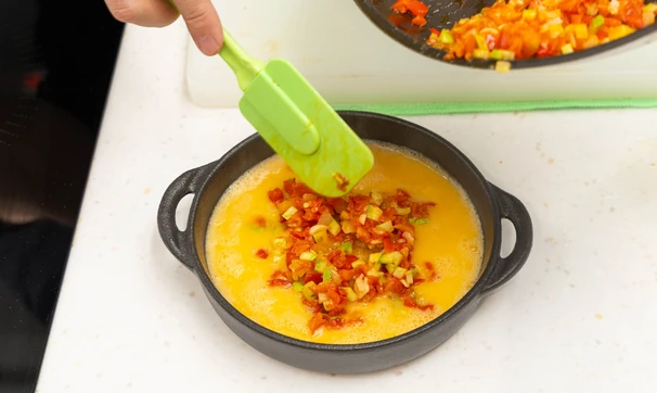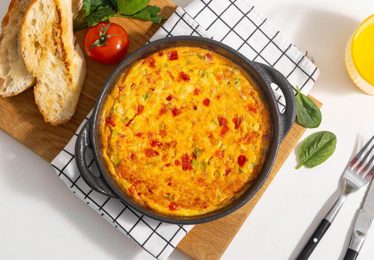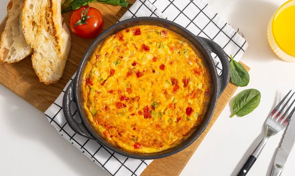 Сытный омлет с овощами и специями понравится и взрослым, и детям. А главное — вы успеете спокойно выпить чашку утреннего чая или кофе, пока блюдо готовится.