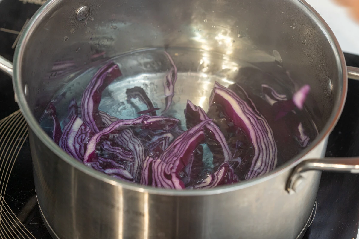 Капусту нашинкуйте. Вскипятите воду и опустите туда капусту. Варите примерно 15 минут, чтобы получился отвар насыщенного синего цвета.