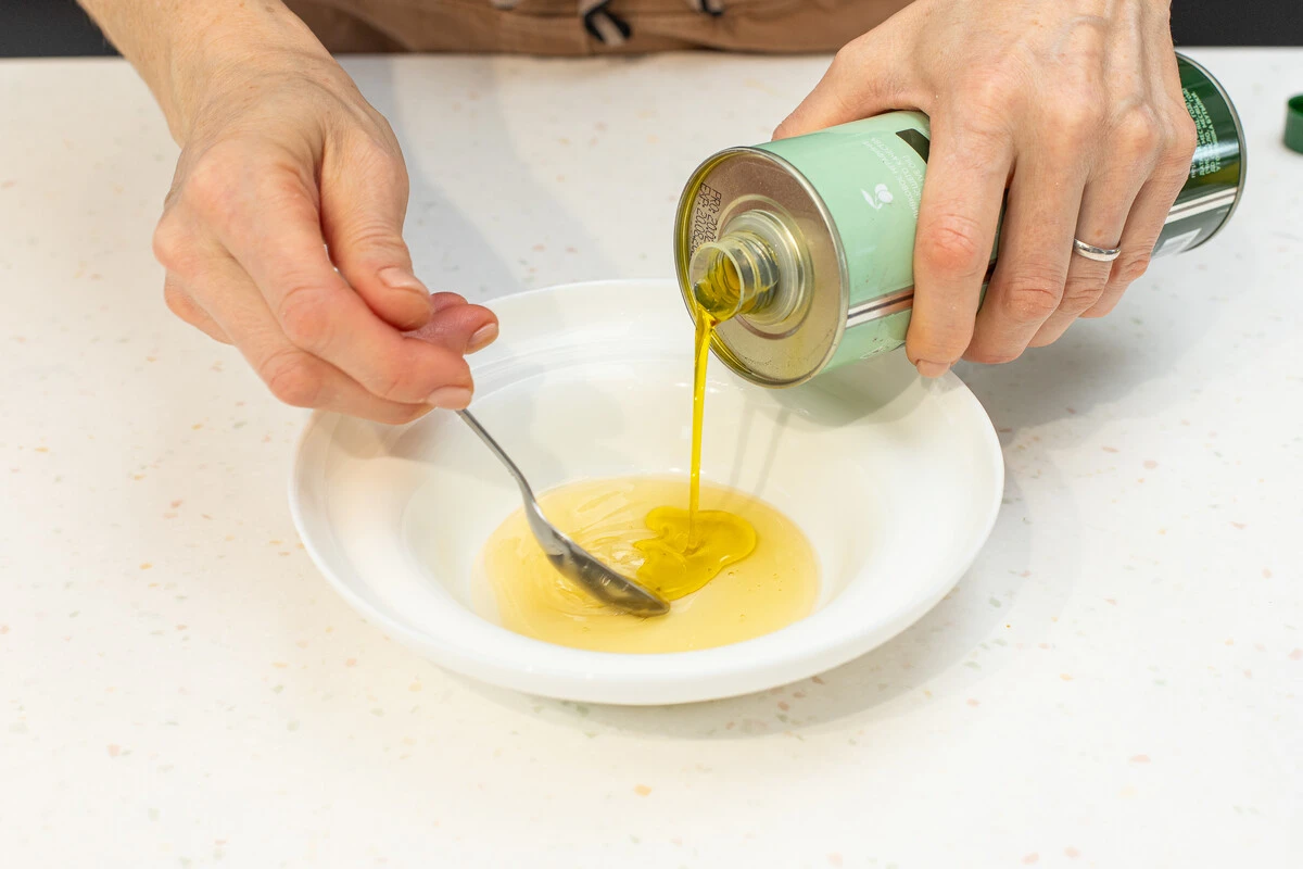 Добавьте в заправку масло и перемешайте снова. Если оливковое масло у вас с ярко выраженным ароматом, можно использовать любое рафинированное по вкусу.