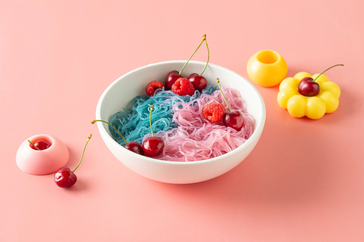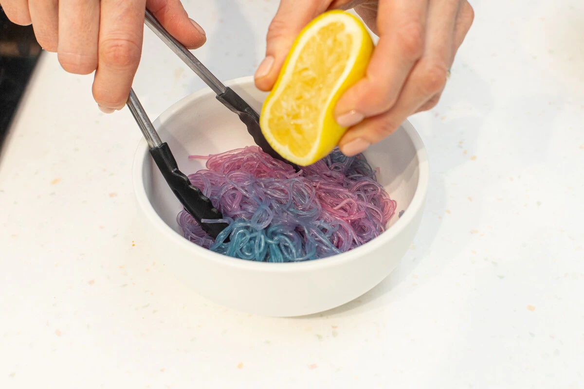 Выложите синюю фунчозу в миску или тарелку, полейте лимонным соком и… вы увидите магию вне Хогварста: лапша из синей за несколько секунд станет сначала сиреневой, а затем пронзительно розовой. Помешайте, чтобы добиться равномерного цвета.