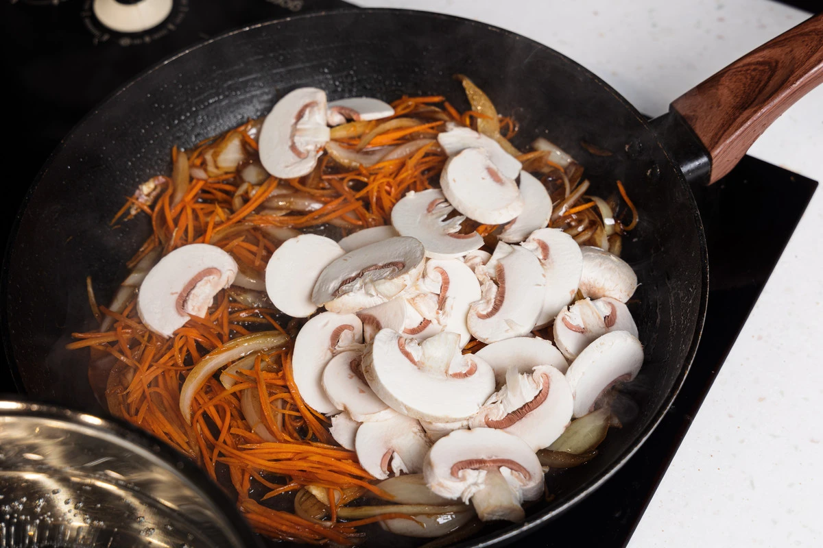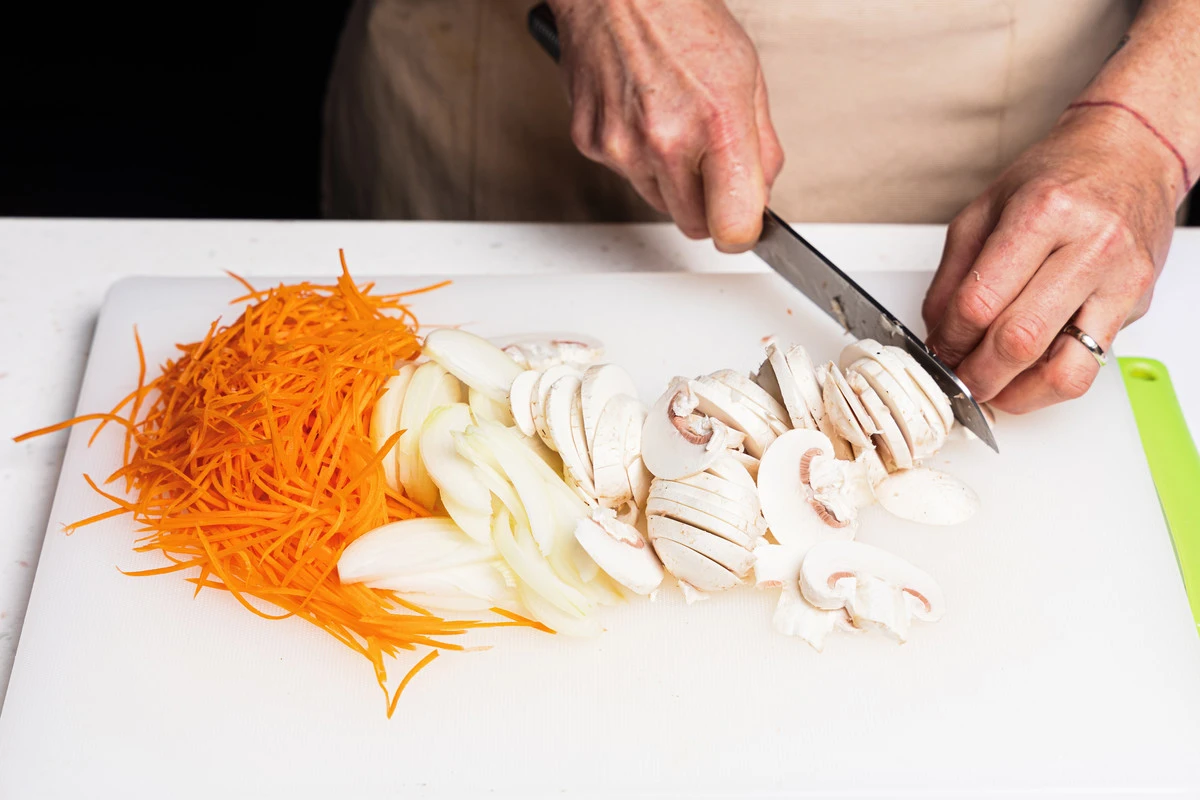 Морковь помойте, почистите и измельчите на тёрке соломкой. Репчатый лук почистите и нарежьте перьями. Грибы протрите салфеткой или промойте, потом обязательно обсушив. Нарежьте грибы пластинами.