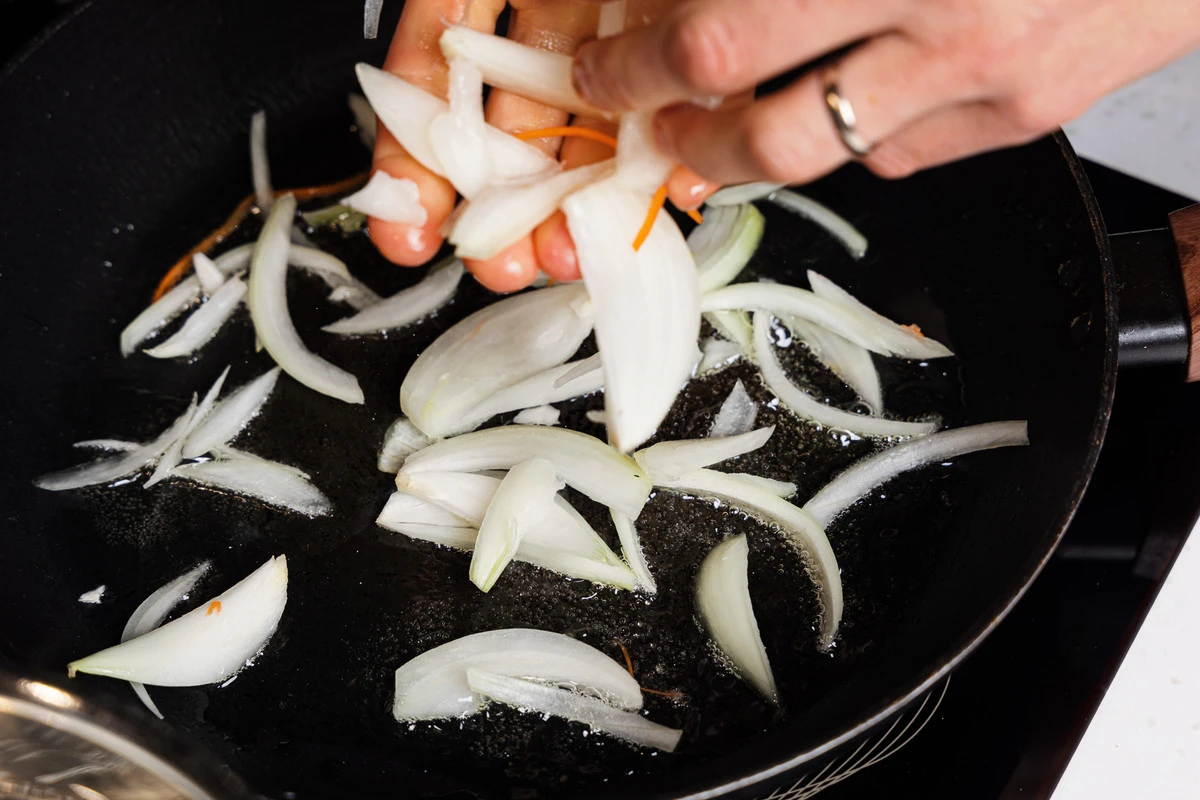 Разогрейте сковороду с двумя видами масел. Выложите лук и готовьте 2 минуты.