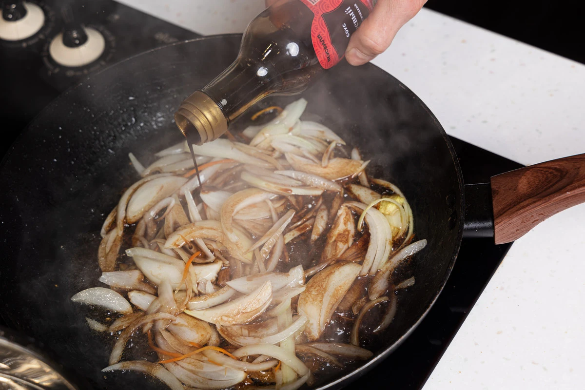 Налейте 1-2 столовые ложки соевого соуса, перемешайте. Добавьте морковь и готовьте ещё 2 минуты.