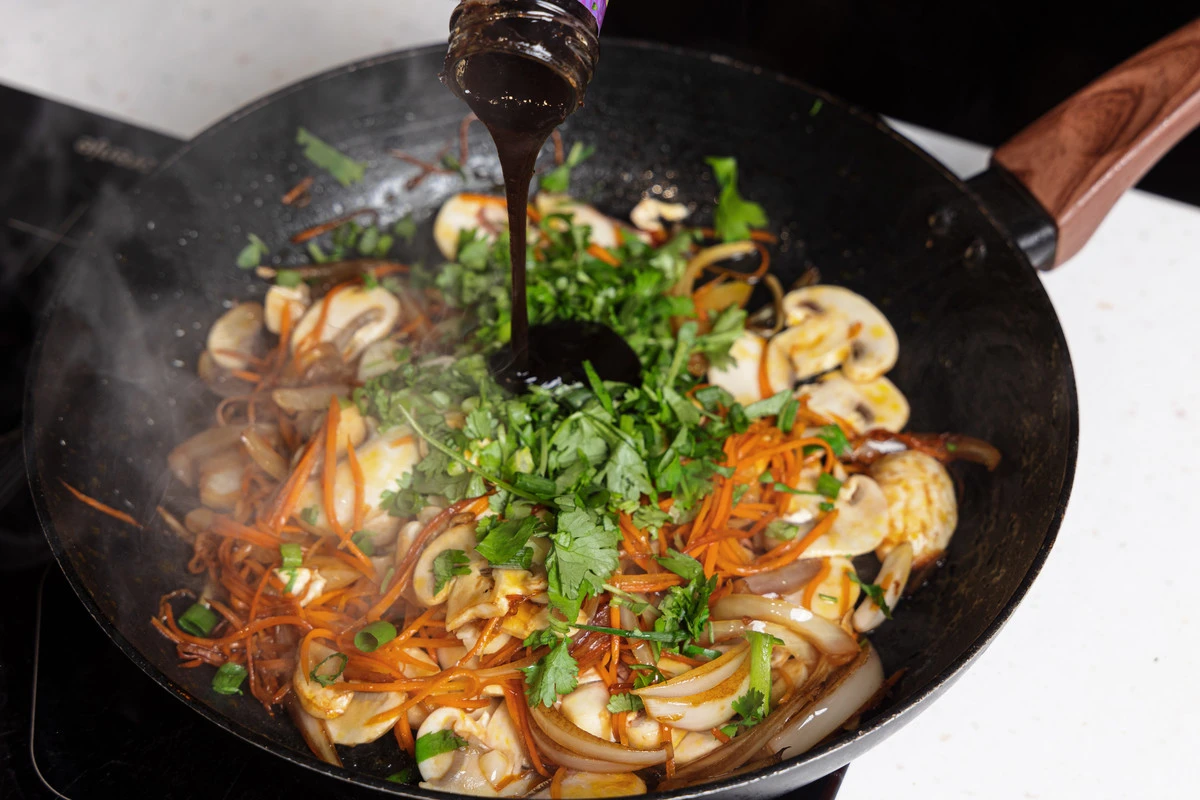 Мелко нарежьте кинзу и зелёный лук. Добавьте зелень к грибам с овощами, влейте 1 ст. ложку соуса терияки, перемешайте и готовьте на среднем огне ещё примерно 7-10 минут, периодически помешивая.