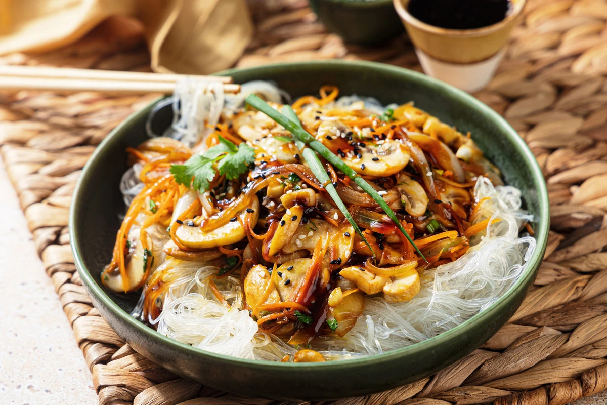 Фунчоза — так называемая стеклянная лапша, которую готовят из бобовых и крахмала. Это блюдо широко распространено в странах Азии. Сама лапша не имеет ярко выраженного вкуса, зато отлично сочетается с другими ингредиентами — мясом, морепродуктами, грибами, овощами — и соусами. Попробуйте приготовить фунчозу по нашему рецепту: такое вкусное горячее блюдо поможет разнообразить меню и его можно есть даже тем, кто придерживается растительного питания.