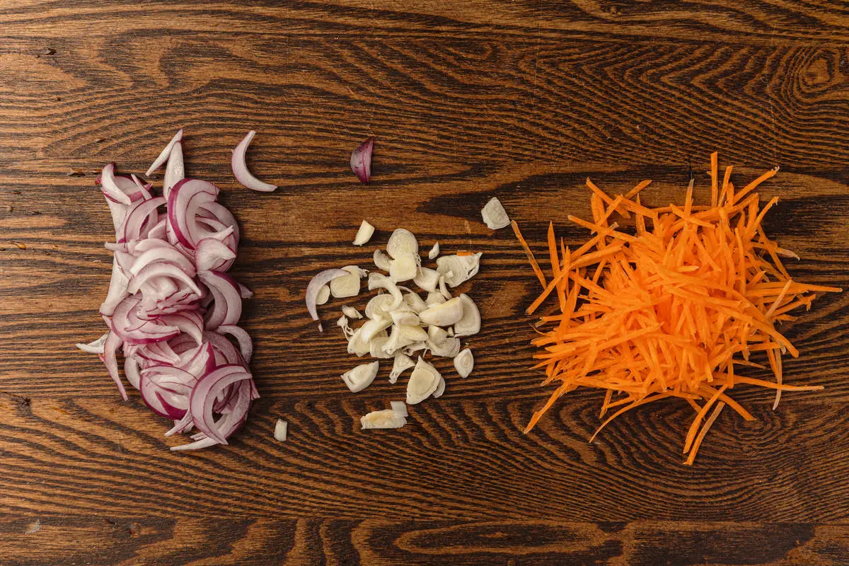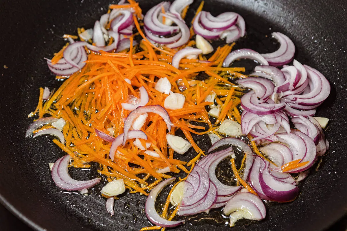 На сковороде обжарьте лук, чеснок и морковь до мягкости.