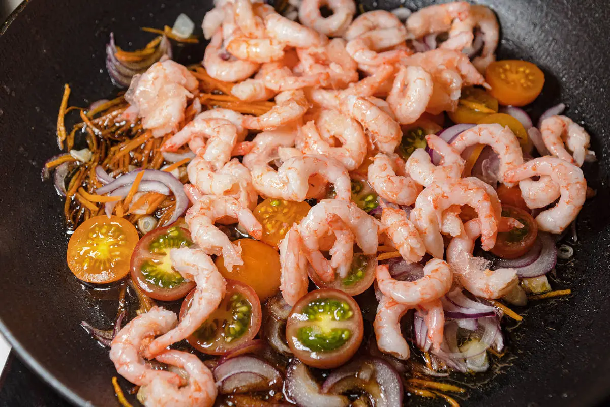 Разморозьте креветки, положив их в холодную воду прямо в упаковке на 30 минут, или заранее в холодильнике в течение 3-4 часов. Промойте в холодной воде и обсушите.