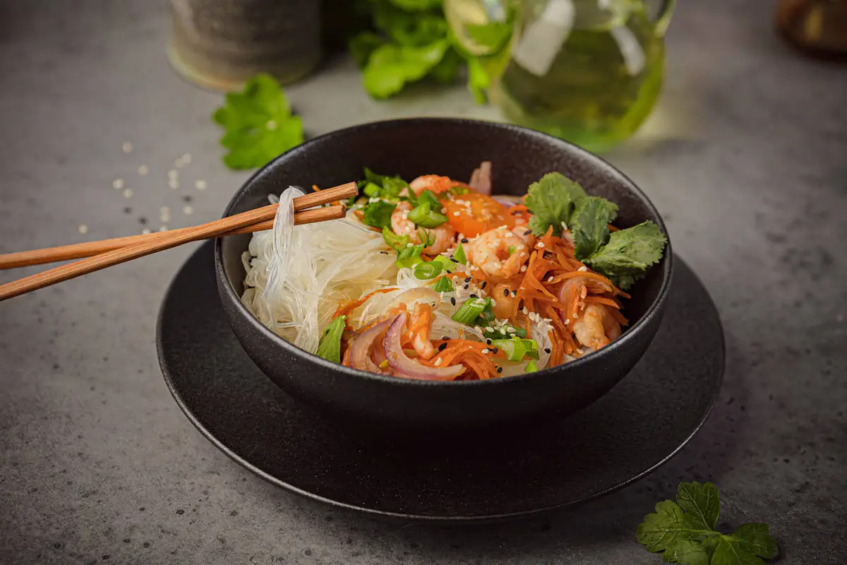 Фунчозу не нужно долго готовить, а креветки достаточно просто разморозить, ведь они уже варёные. И получится очень вкусный и быстрый ужин в азиатском стиле.