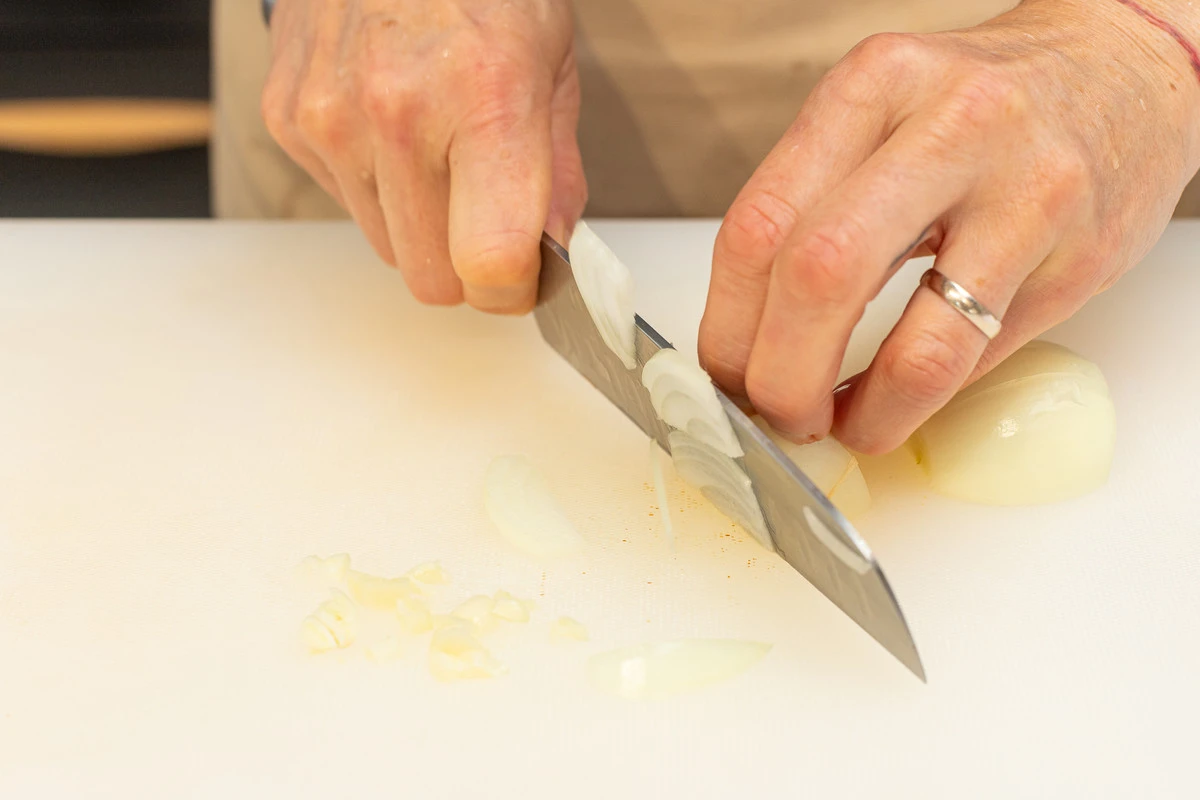 Измельчите чеснок, лук нарежьте перьями. Налейте кунжутное масло в сковороду, добавьте лук и чеснок.
