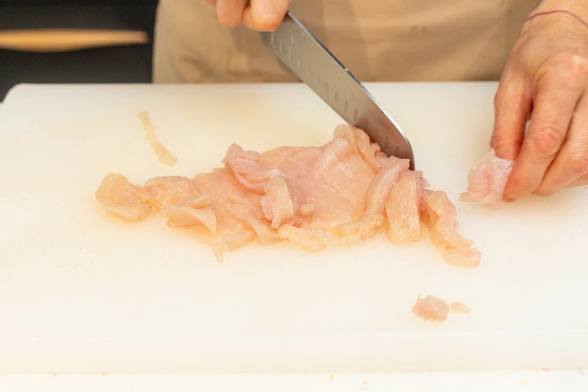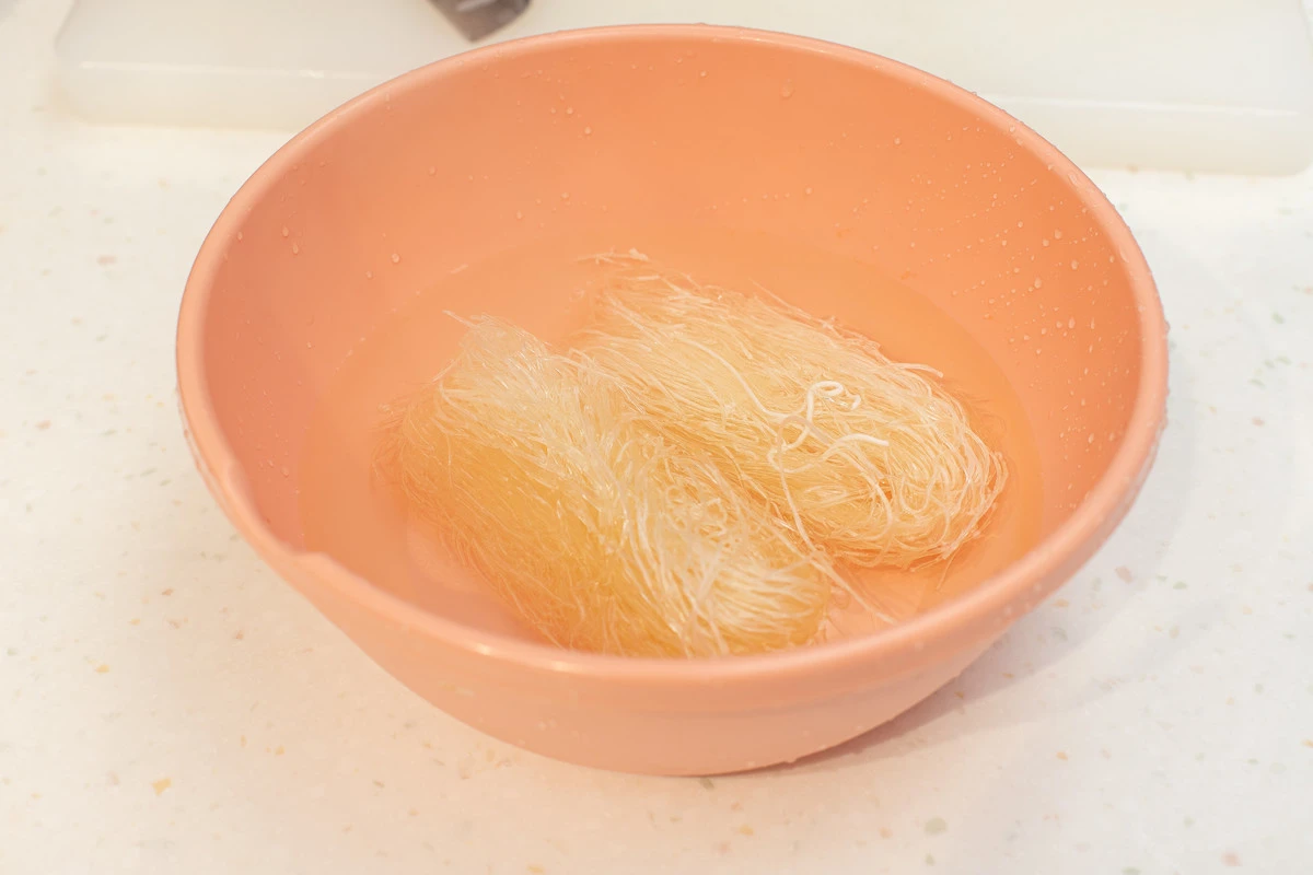 Фунчозу залейте кипятком, оставьте на пару минут до размягчения. Слейте воду или достаньте фунчозу из воды щипцами.