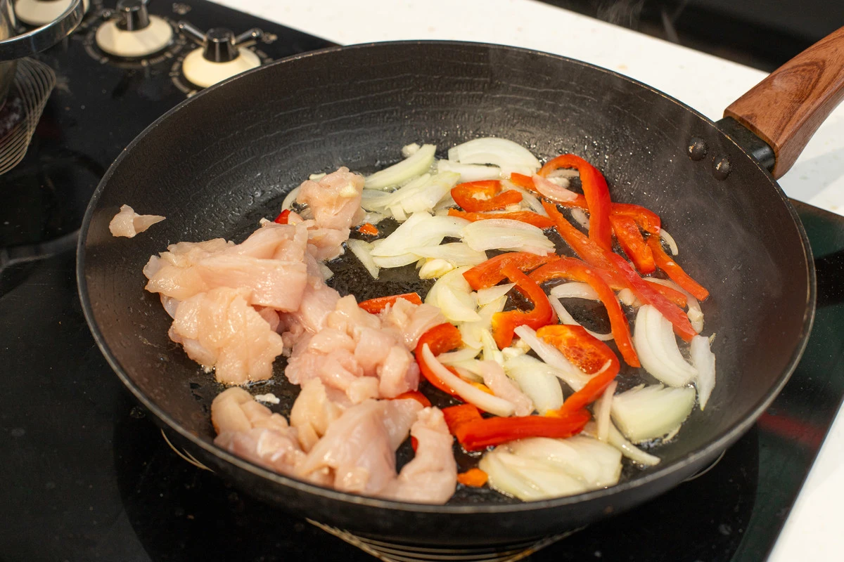 Выложите курицу и перец в сковороду к луку с чесноком.
