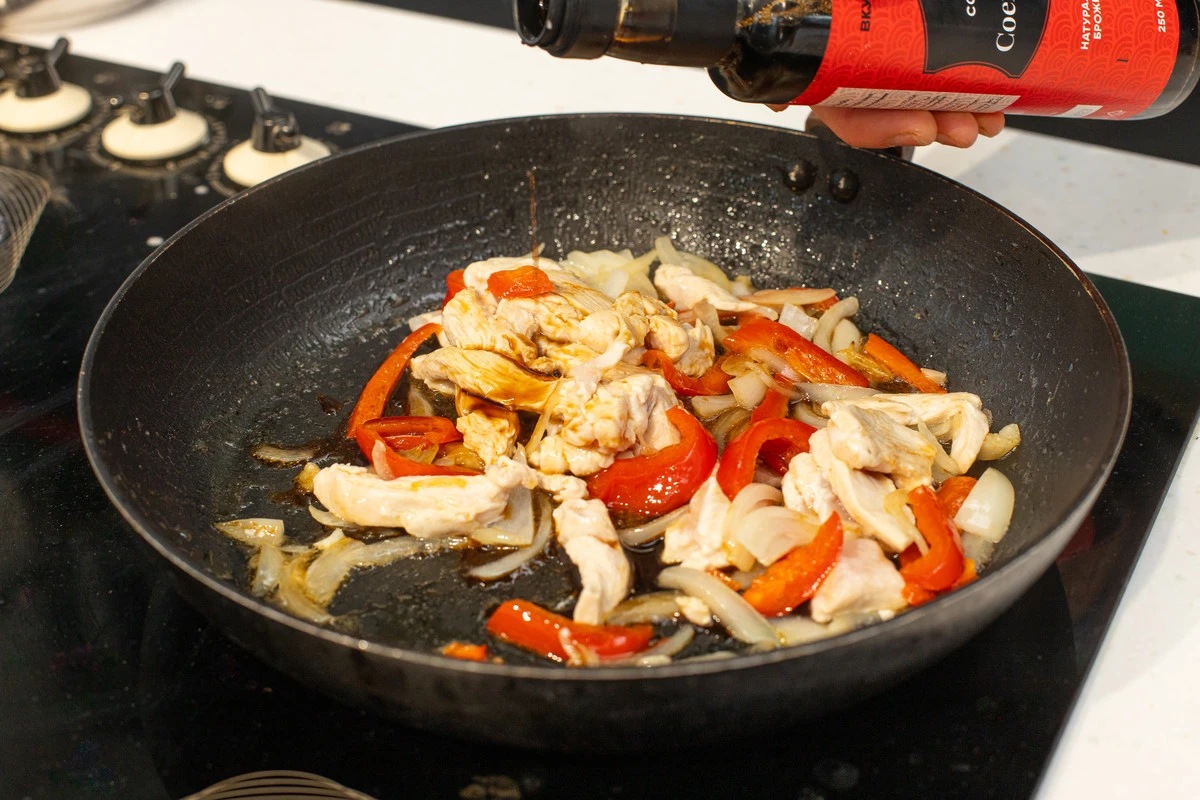 Добавьте соевый соус и кунжут, готовьте всё вместе примерно 5-7 минут на среднем огне.