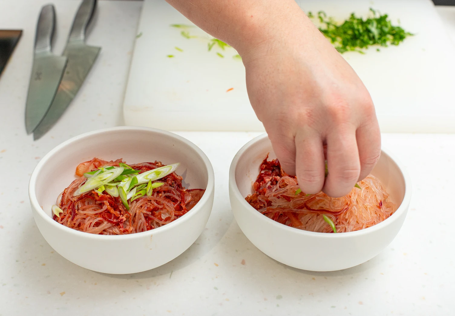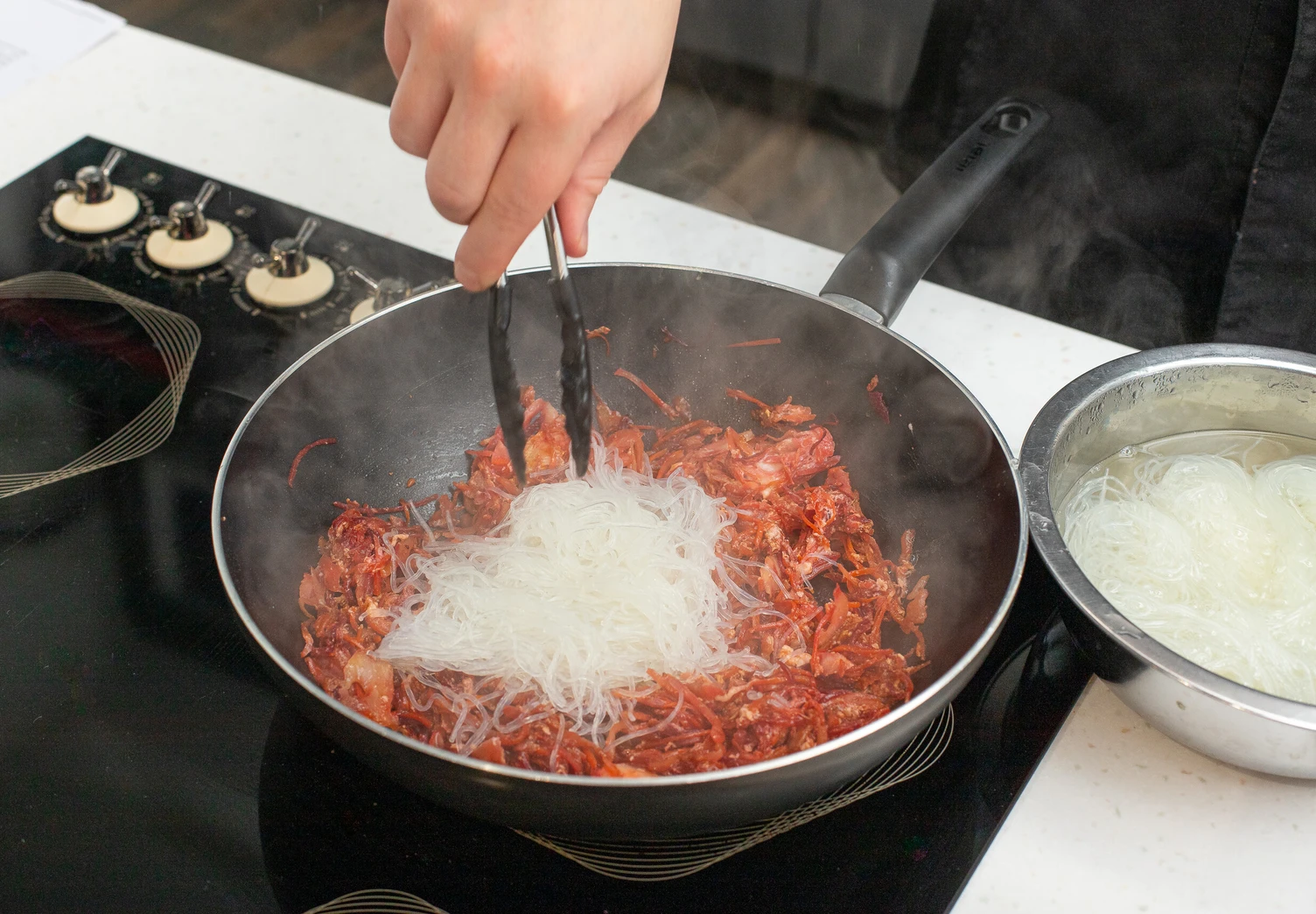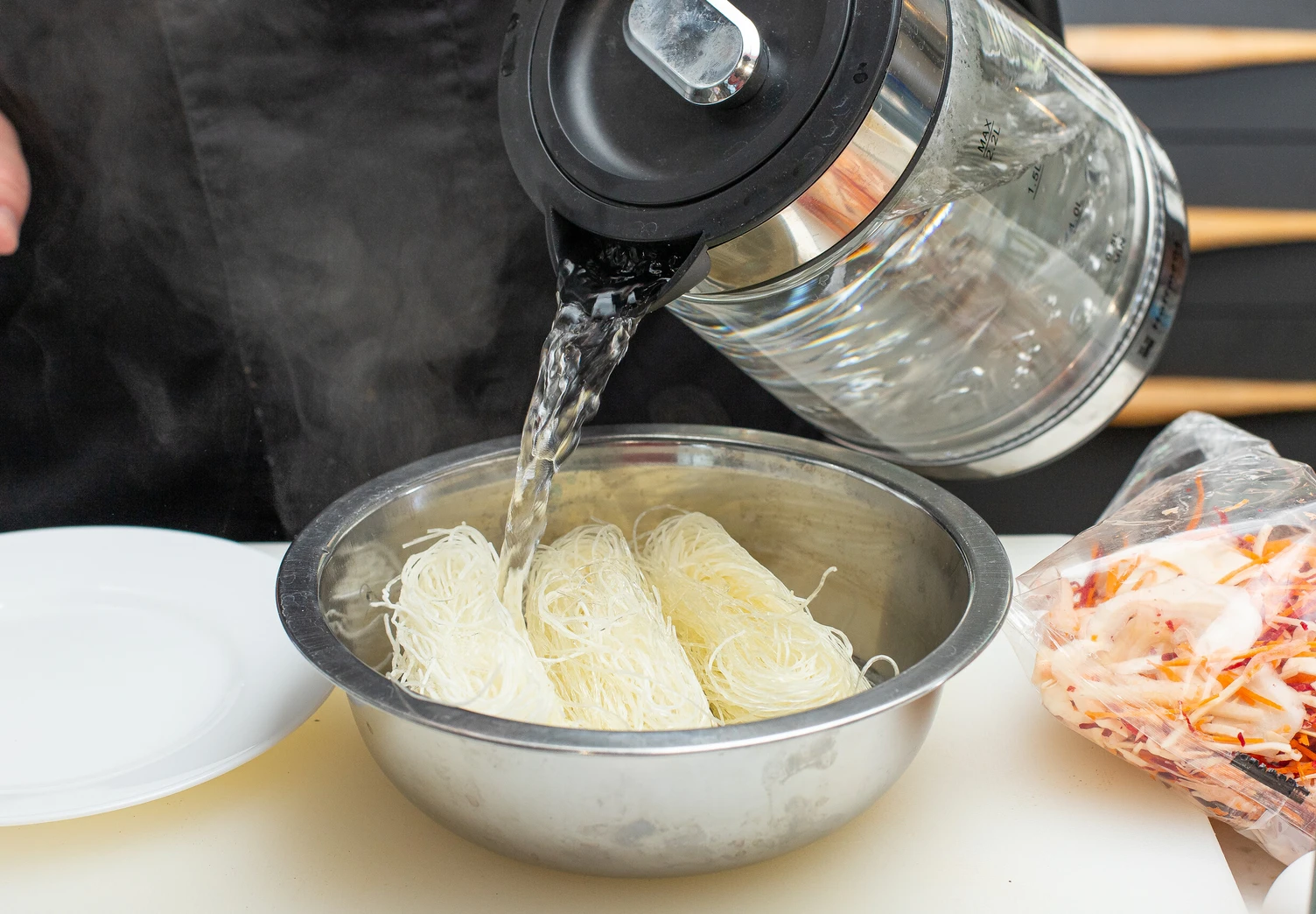Заварите фунчозу кипятком и оставьте на 5 минут.