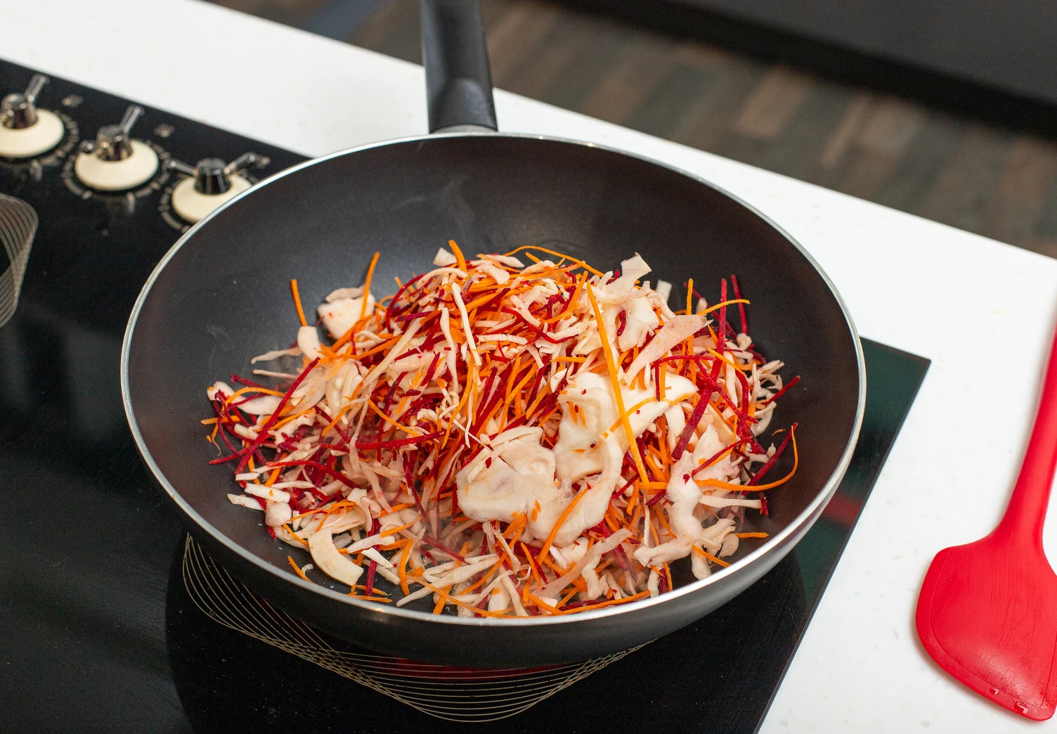 Совет: если у вас остались овощи после варки борща — дайте им вторую жизнь в этом рецепте! Или используйте готовую смесь «Витаминное трио» — так ещё удобнее.