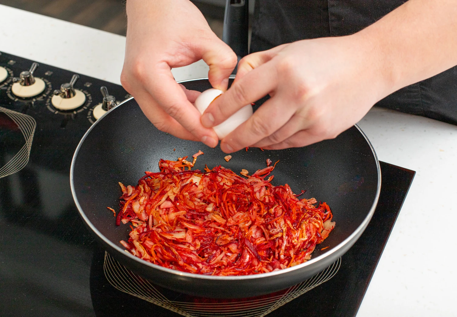 Разбейте яйцо в овощи и быстро размешивайте, пока яйцо не схватится.