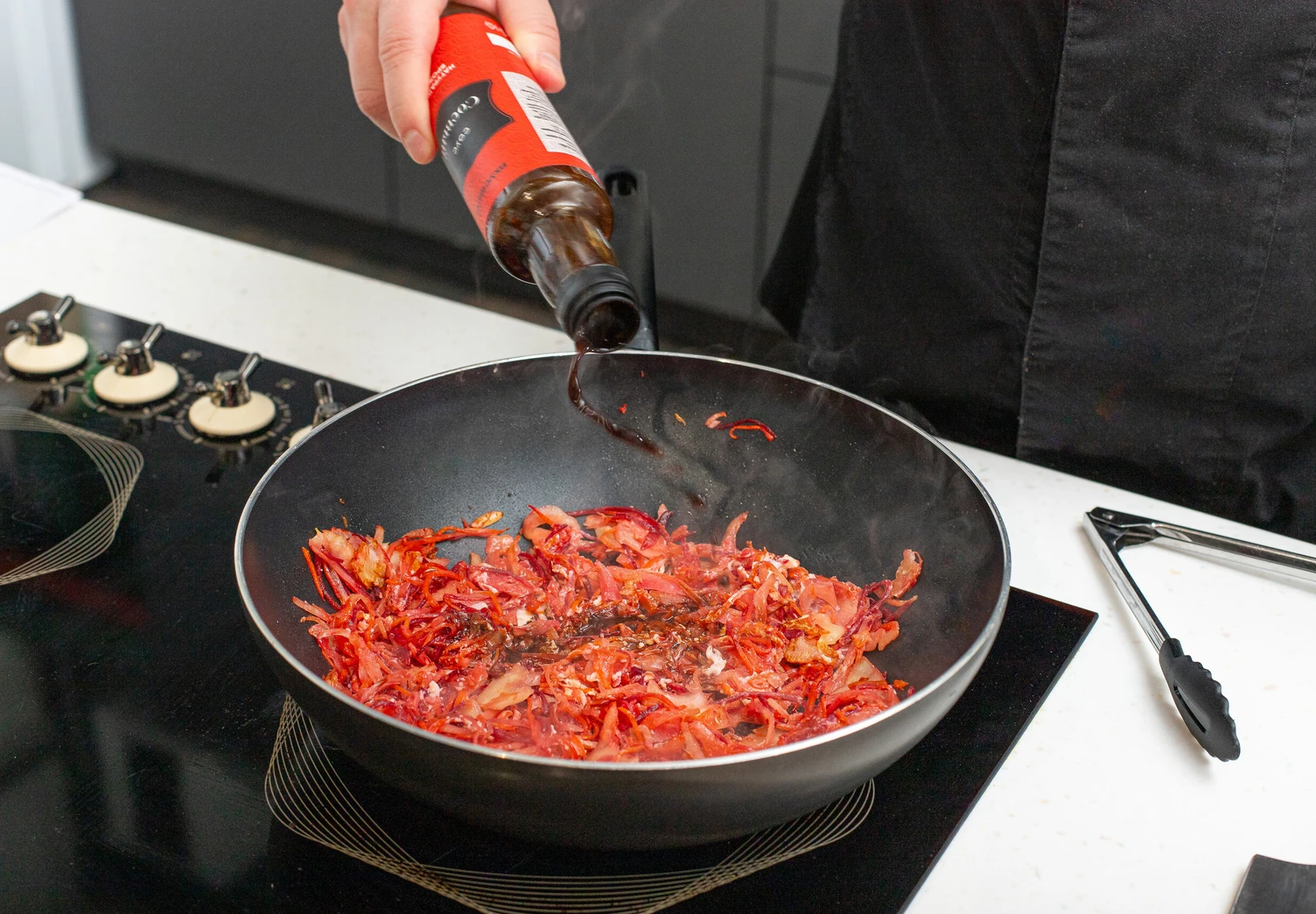 Добавьте к овощам соевый соус и соус терияки, смешайте до равномерного распределения соусов.