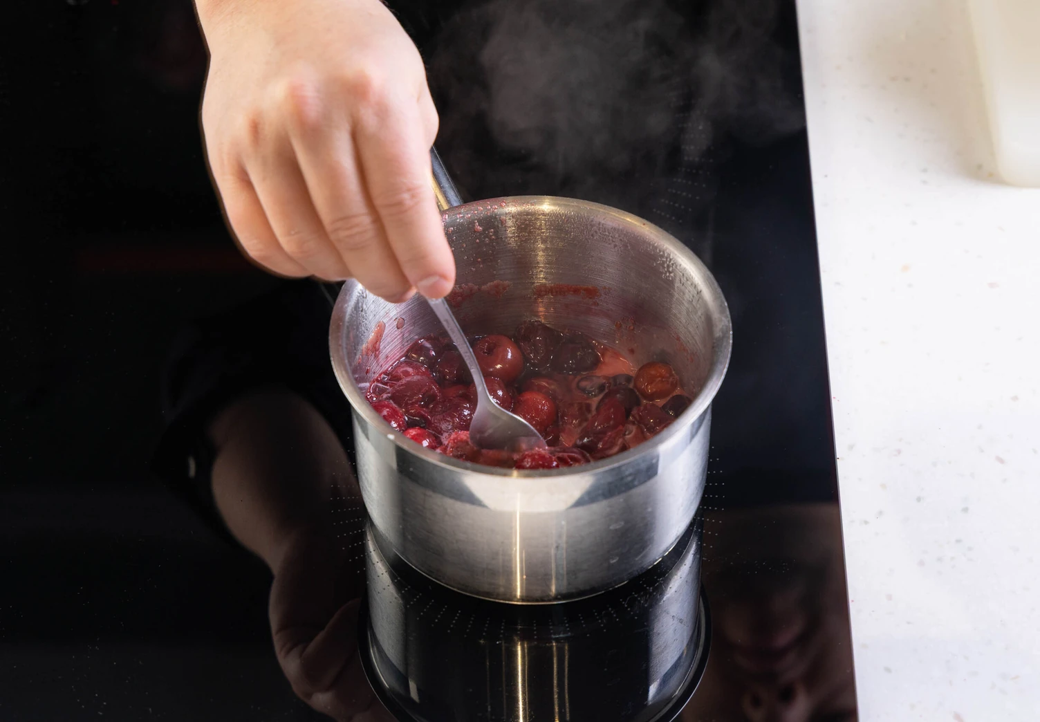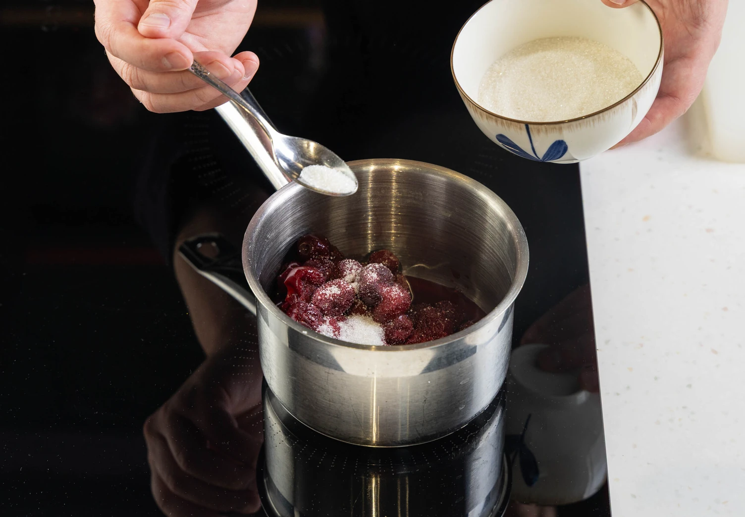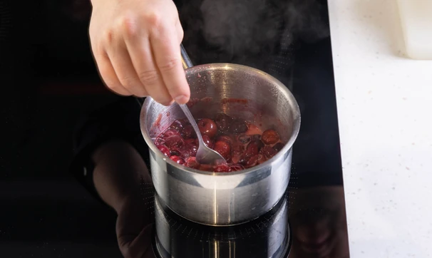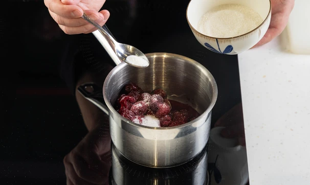 Переложите вишню в ковш или сотейник, добавьте сахар и поставьте на средний огонь. Прогревайте 2–3 минуты, помешивая. Ягоды должны пустить сок.