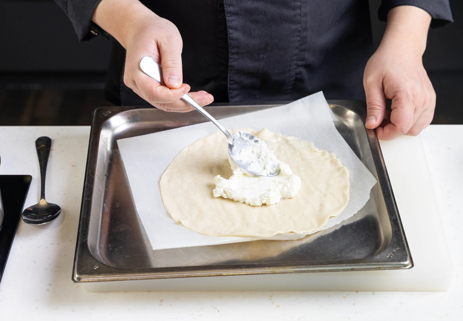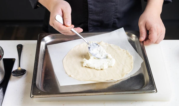 Смажьте каждую лепёшку рикоттой, отступая от краёв 1–2 см.