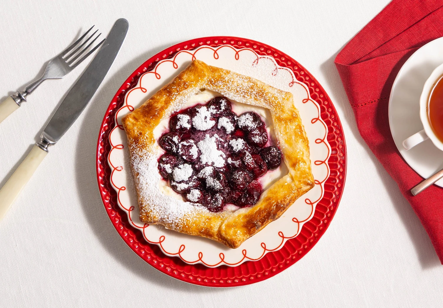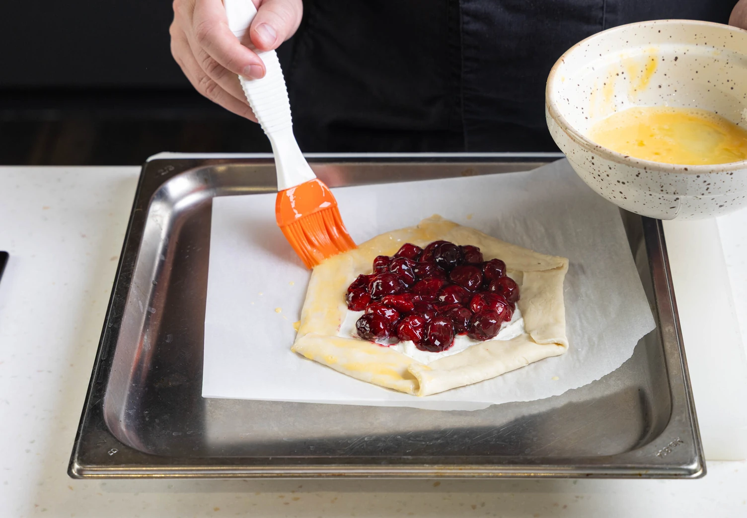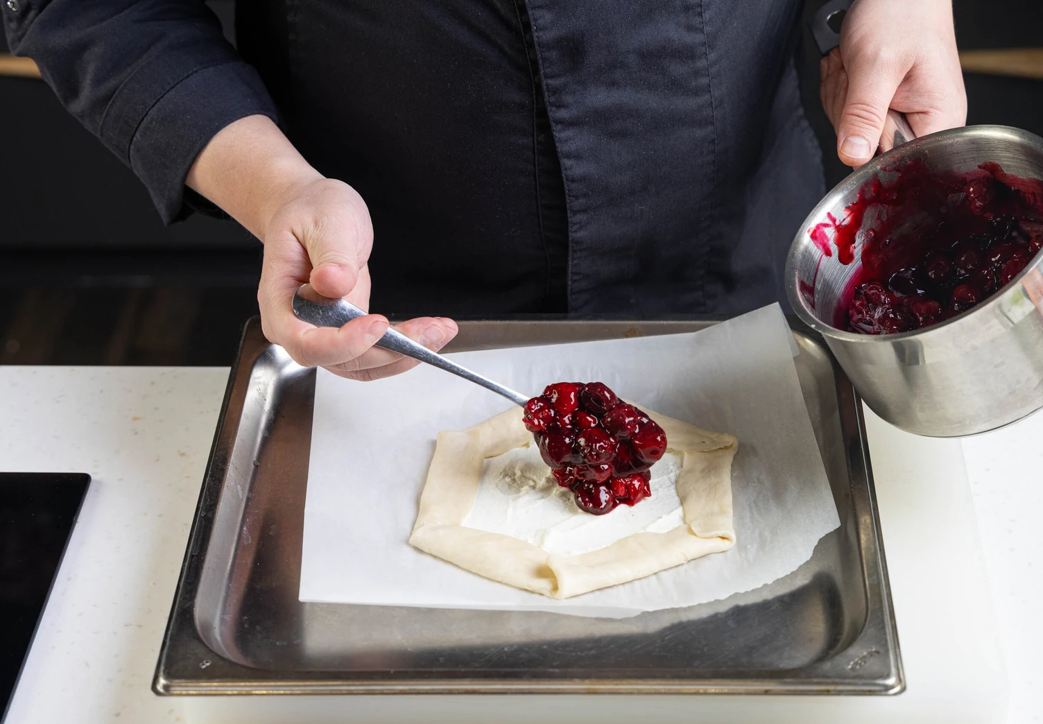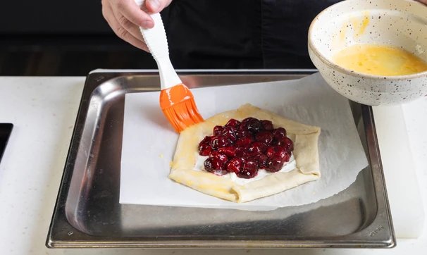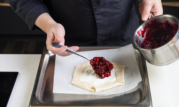 Затем аккуратно защипните их, чтобы получился невысокий бортик, и выложите остывшую вишнёвую начинку сверху.