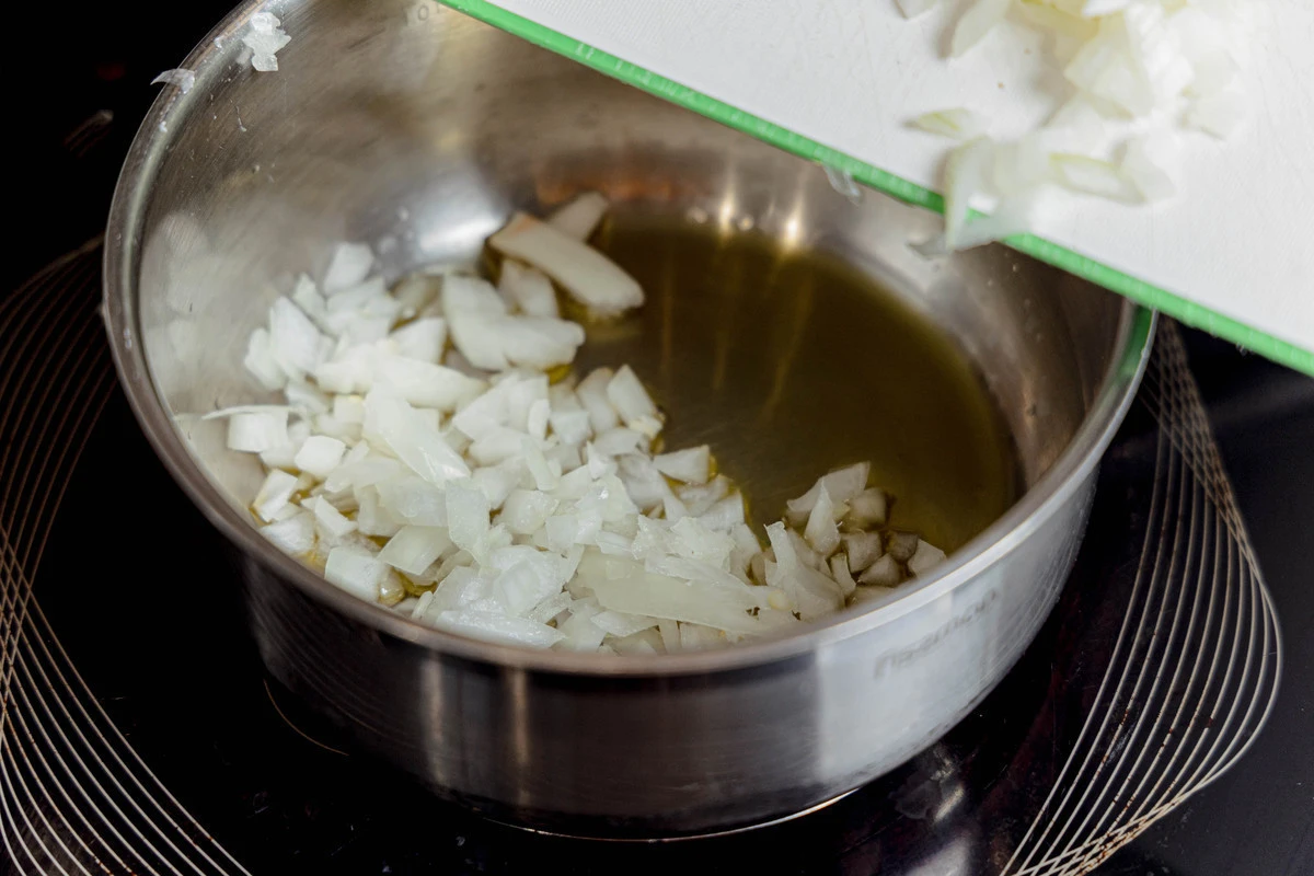 Лук нарежьте кубиками, обжарьте на оливковом масле в сотейнике.