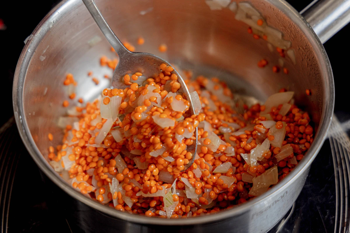 Красная чечевица варится быстрее всех остальных видов бобовых, превращаясь в густое и ароматное почти пюре.