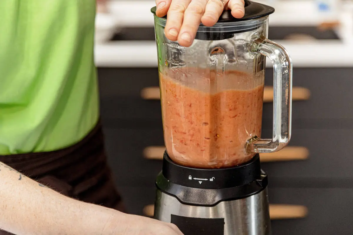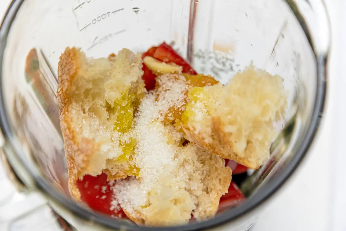 Оставшиеся томаты сложите в блендер вместе с хлебом, томатным соком и чесноком, пробейте до однородности. Добавьте по вкусу соль и сахар, опционально можно добавить чуть-чуть лимонного сока или уксуса.