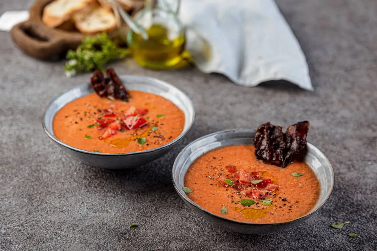 Более сытный и густой вариант гаспачо с добавлением хлеба, в идеале чуть подсохшего, вчерашнего. Чипсы из бекона добавляйте по желанию. Также при подаче можно добавить половинки варёных яиц, базилик или петрушку.