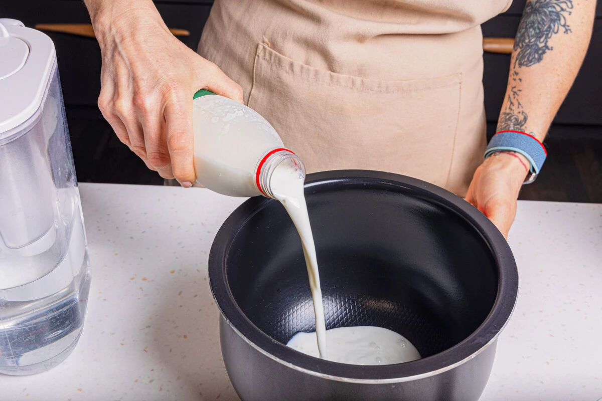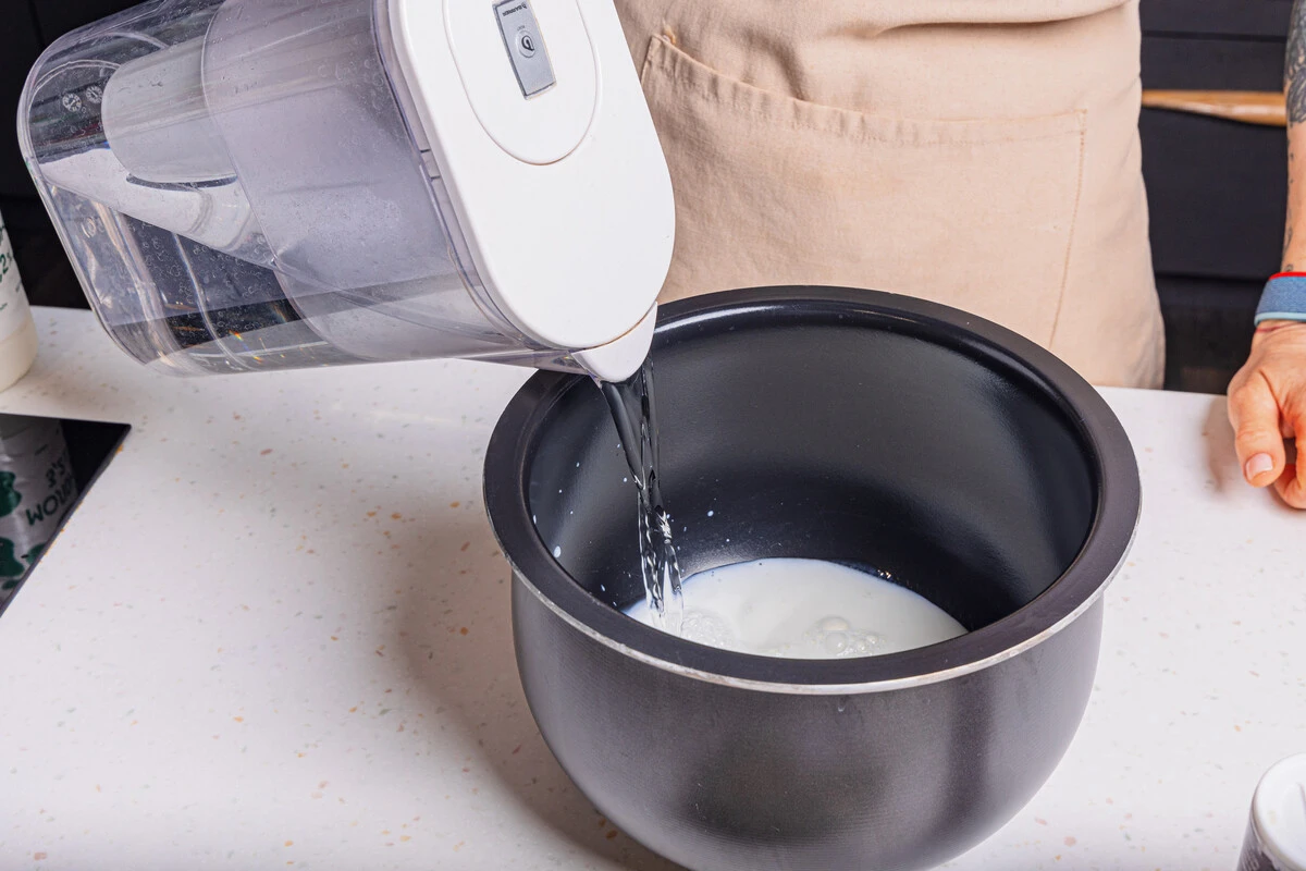 Добавьте воду. Если любите более жидкую кашу, влейте немного больше молока и воды — например, 600 мл и 400 мл соответственно или по вкусу.