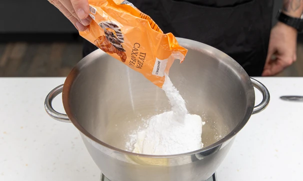 Готовую карамель (можно сделать по этому рецепту) или сгущёнку переложите в кондитерский мешок, срежьте у него кончик диаметром 3–5 мм.