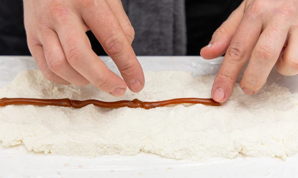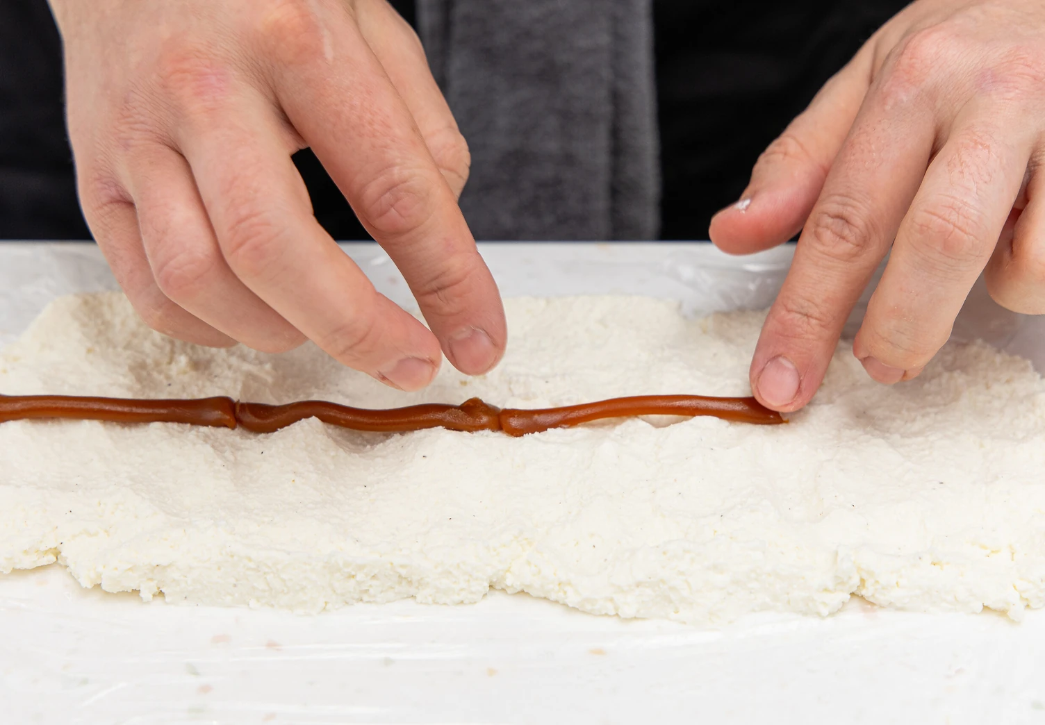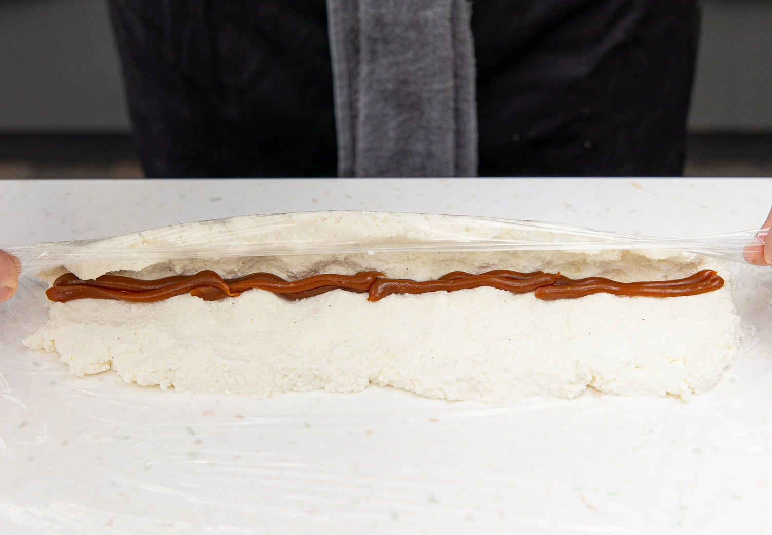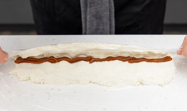 Творожную массу равномерно распределите по пищевой плёнке и выложите на неё, немного отступив от нижнего края, застывшие полоски карамели или сгущёнки.