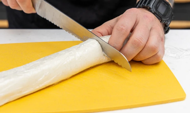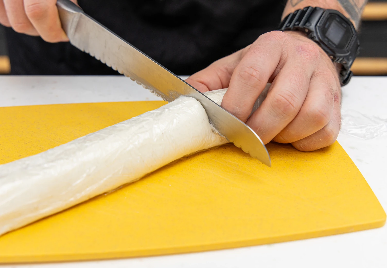 Заверните рулет в пищевую плёнку, через неё придавая ему ровную форму, и нарежьте на сырки. Уберите изделия в морозилку на 30 минут.
