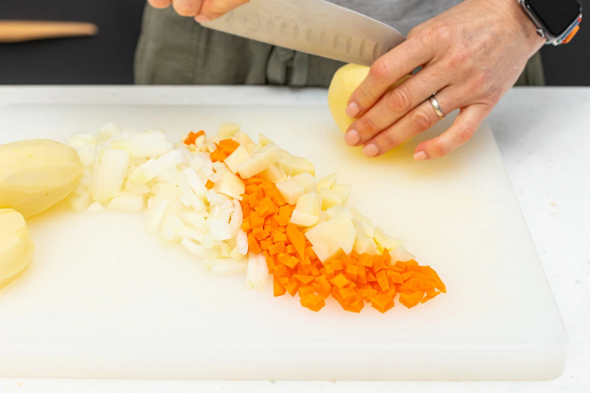 Лук, морковь и картофель помойте и почистите. Нарежьте кубиками среднего размера. Чеснок нарежьте кусочками среднего размера или ломтиками.