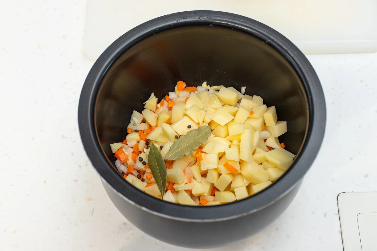 Сложите овощи в чашу мультиварки. Добавьте лавровый лист и чёрный перец горошком.