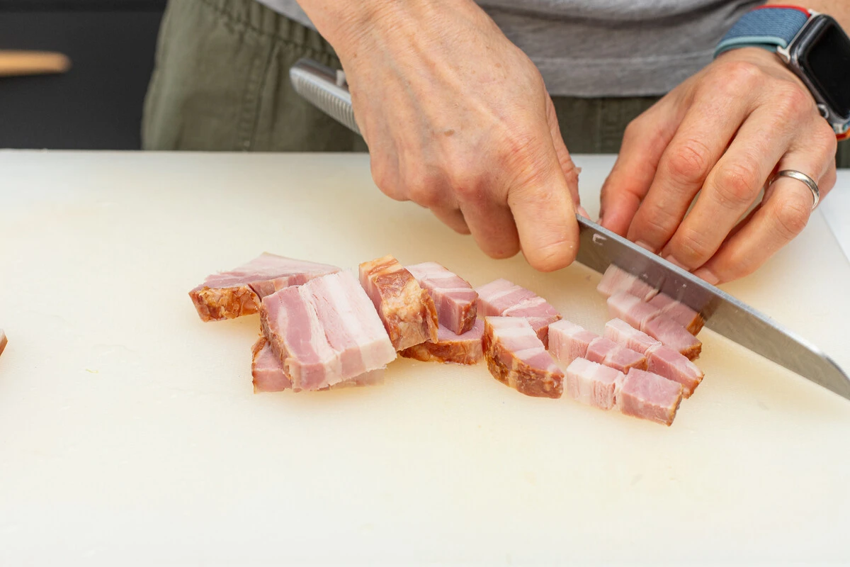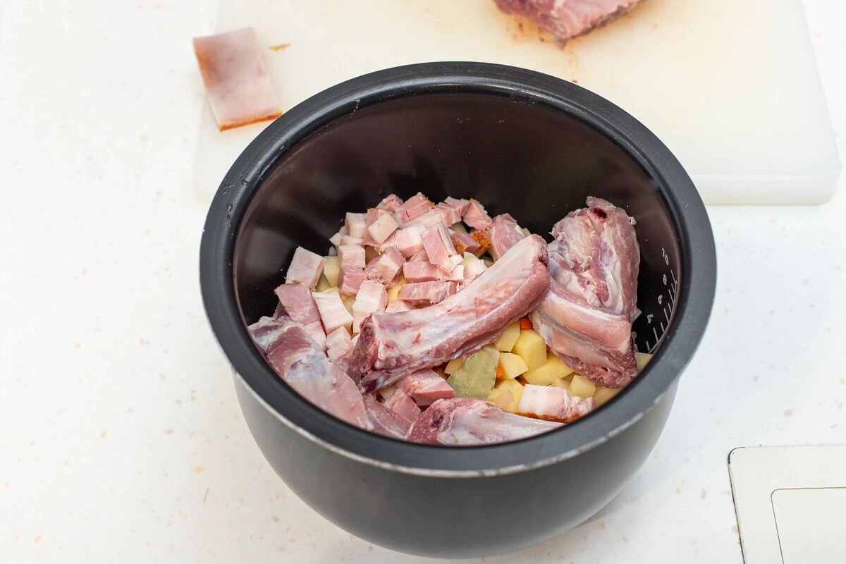 Грудинку нарежьте кубиками, бекон — кусочками среднего размера, рёбрышки разделите по одному. Можно использовать любые копчёности на ваш вкус: грудинку, рёбрышки, бекон, сосиски, колбаски и т. п.