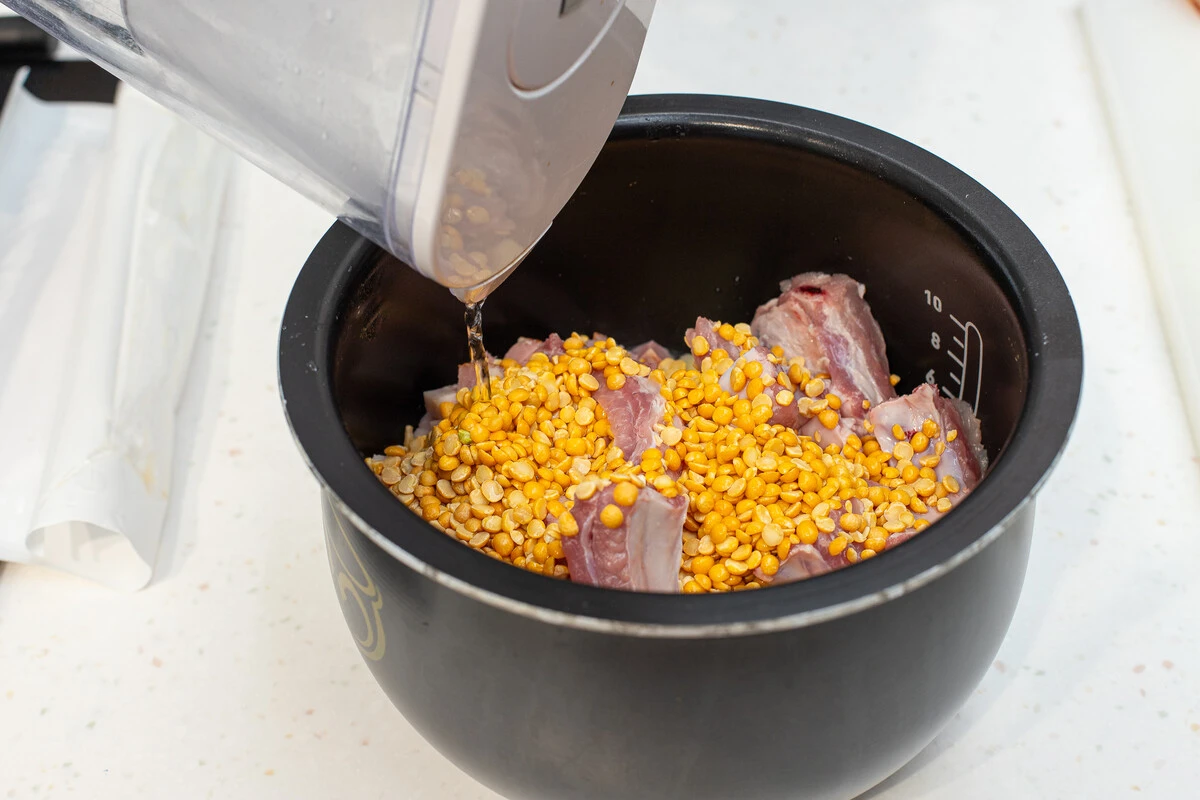 Насыпьте горох. При необходимости предварительно промойте его (например, если покупаете развесной). Посолите по вкусу и залейте суп водой до отметки «максимум». Выберите программу «Суп» и установите время приготовления 1 час. Если у вашей мультиварки такой программы нет, выберите режим «Тушить» или «Тушение», если ему соответствует температура 90-100 ℃ (это должно быть указано в инструкции или книге рецептов к вашей модели мультиварки) или же режим ручной настройки, установив температуру 90-95 ℃. Примерное время приготовления горохового супа — 1-2 часа, точное время будет зависеть от модели и настроек вашей мультиварки.