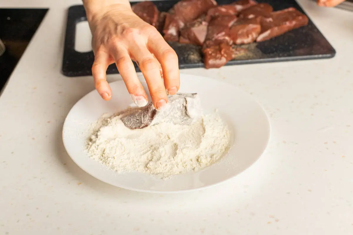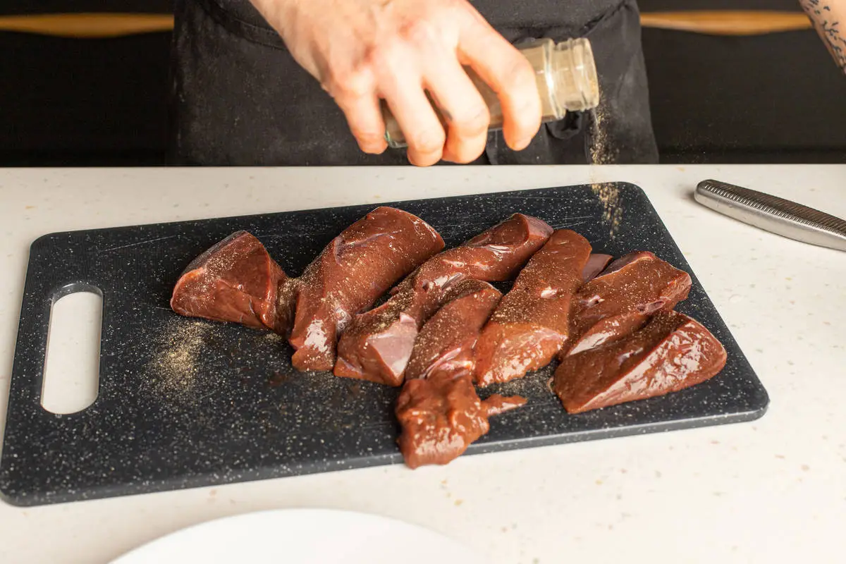 Разрежьте печень на порционные куски, удалите все пленки, промойте и обсушите.