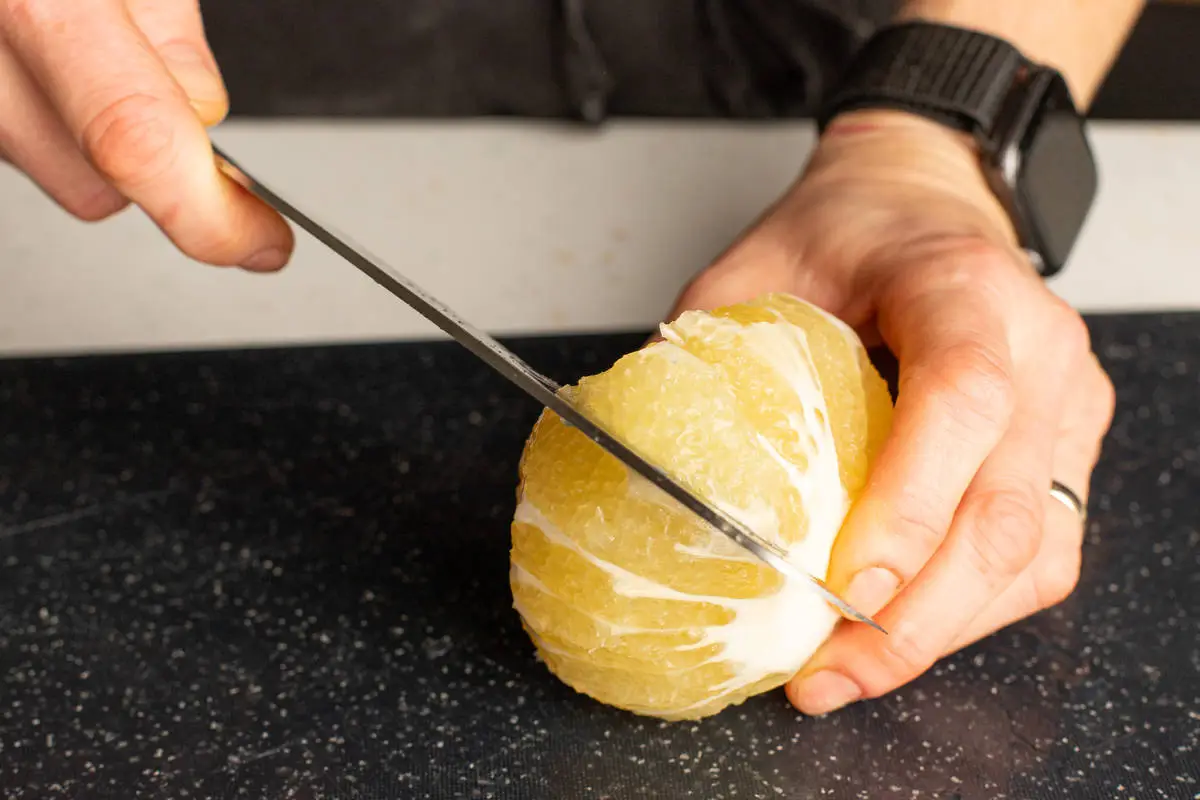 С апельсина и свити срежьте кожуру при помощи ножа, аккуратно вырежьте дольки из мякоти, без кожуры и белой части.