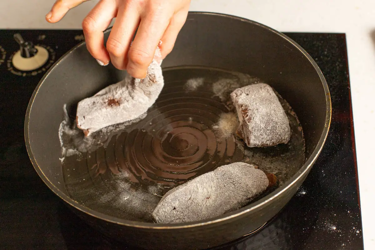 Кусочки печени в муке быстро обжарьте на оливковом масле до корочки с двух сторон, примерно по 1 минуте.