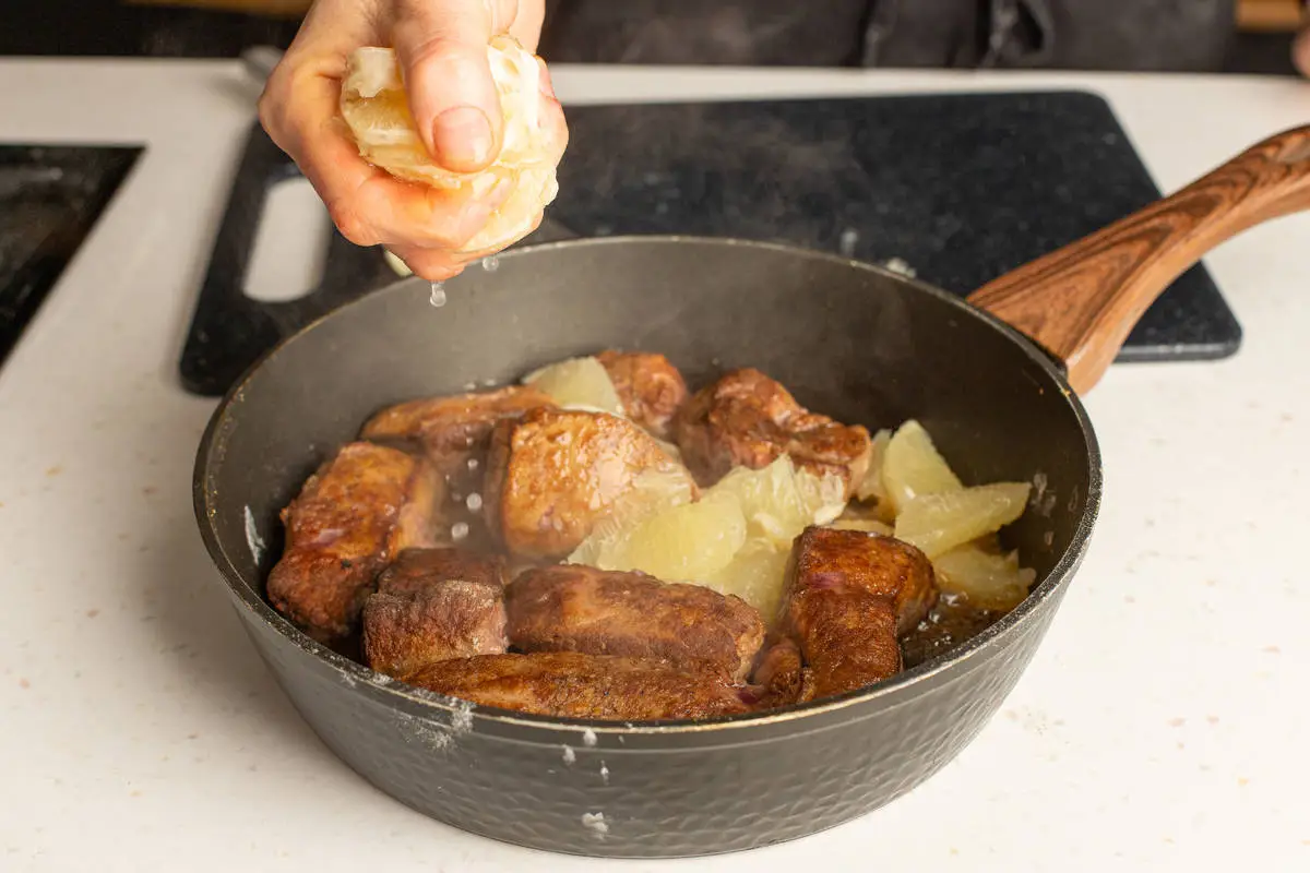 Добавьте дольки цитрусовых и тушите всё около 10 минут.