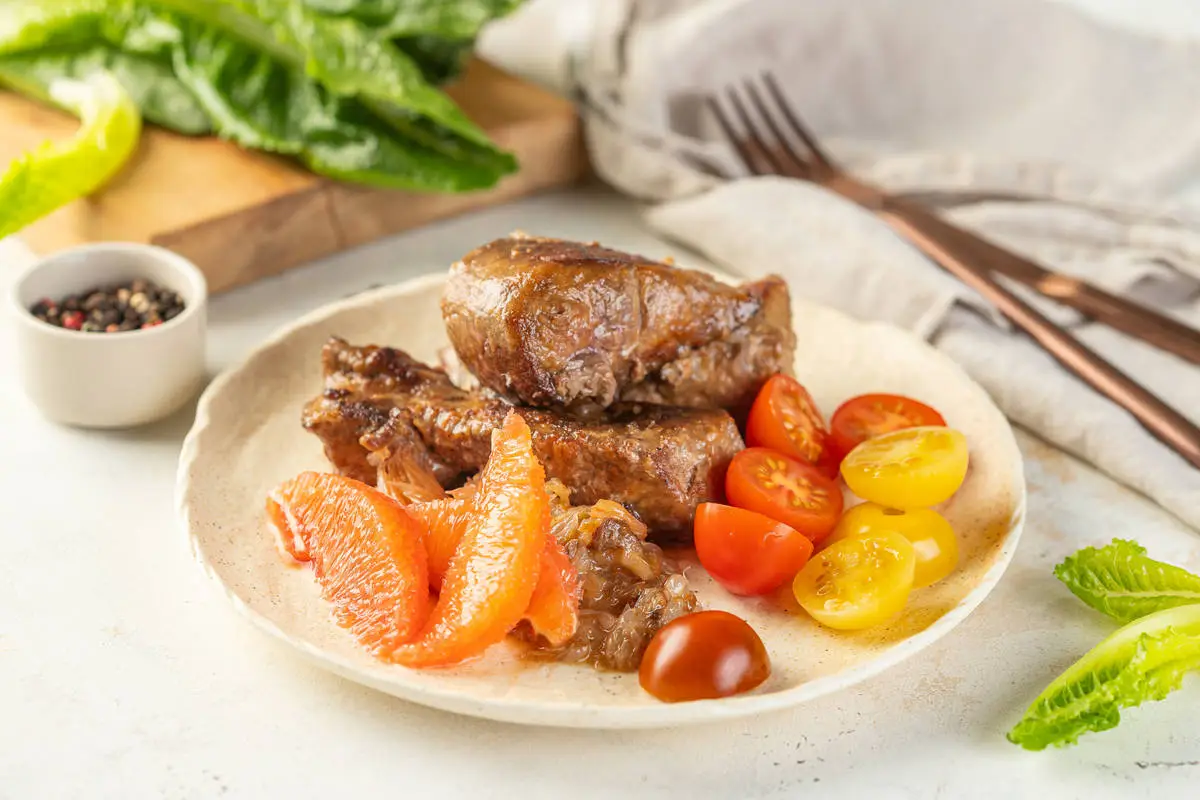 Подавайте печень с цитрусовыми и разрезанными пополам помидорами черри.