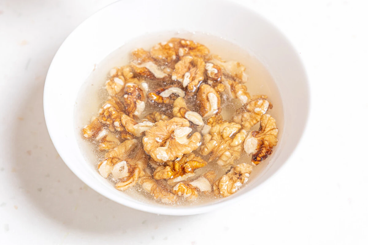 Орехи залейте кипятком примерно на 15 минут, пока не остынет вода.