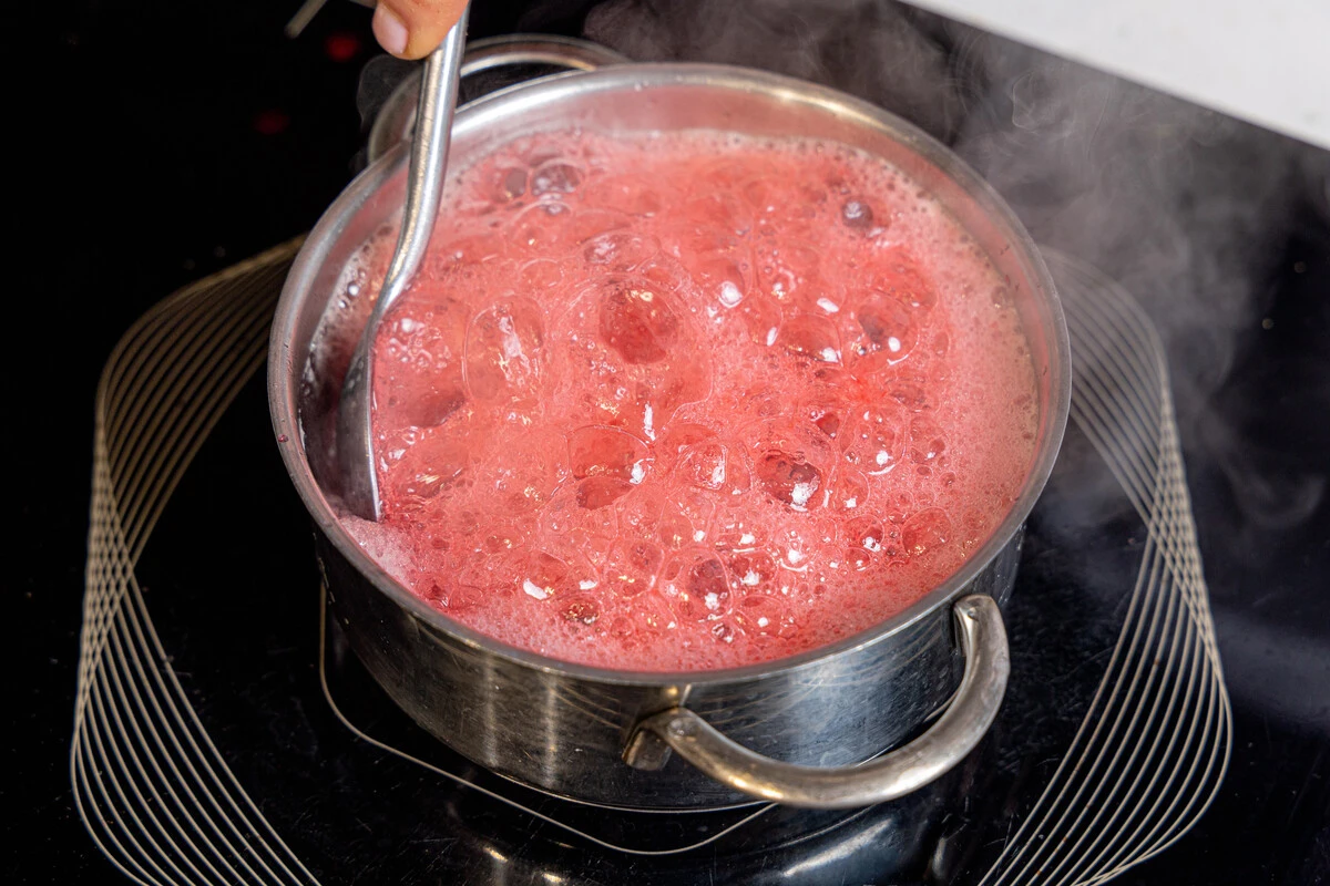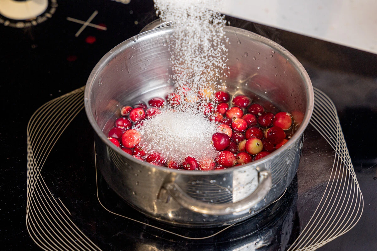 Доведите до кипения и готовьте примерно 5-7 минут на среднем огне, чтобы вода максимально выпарилась. Периодически аккуратно помешивайте (осторожно: клюква, скорее всего, будет лопаться в процессе, а сок — слегка брызгать).