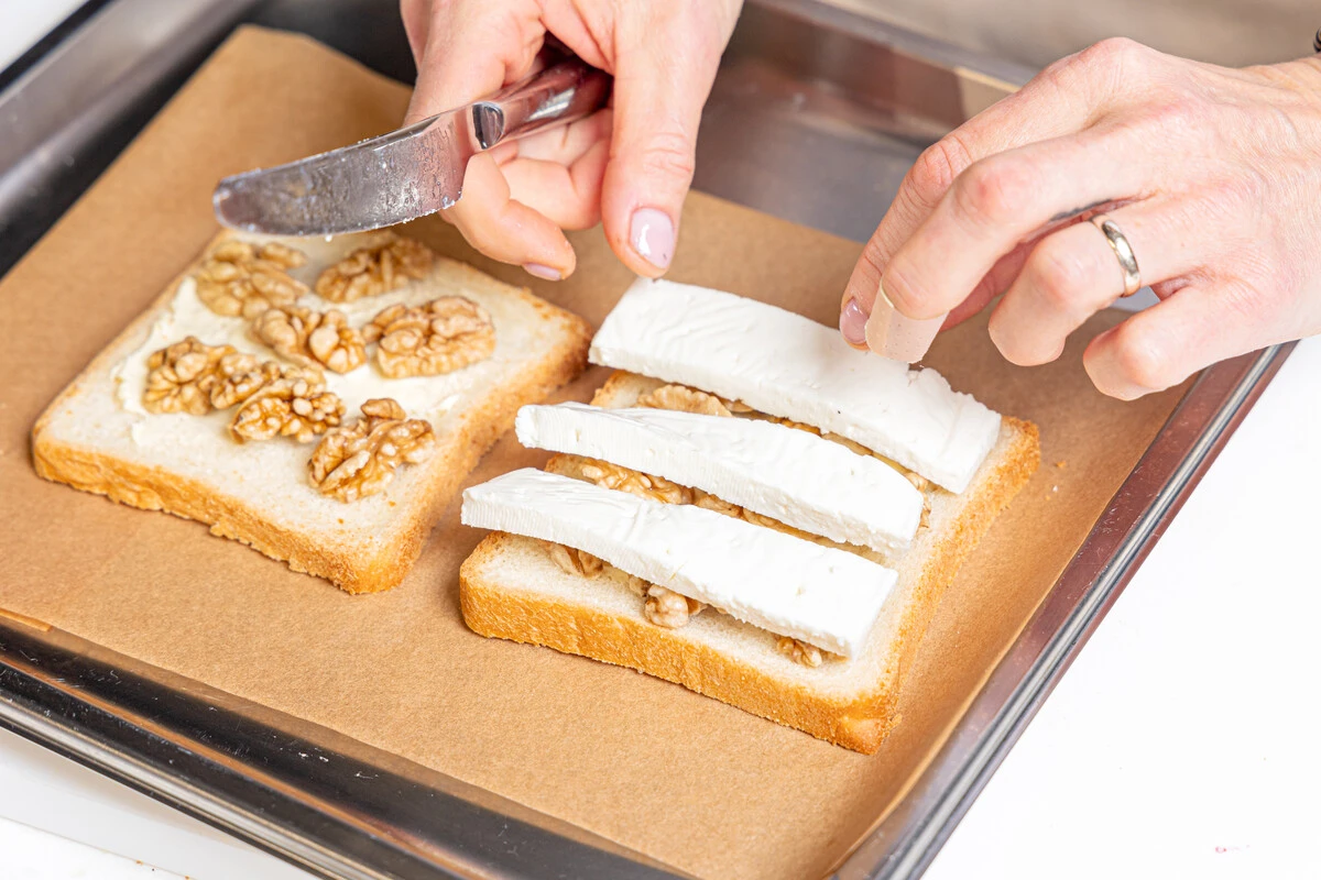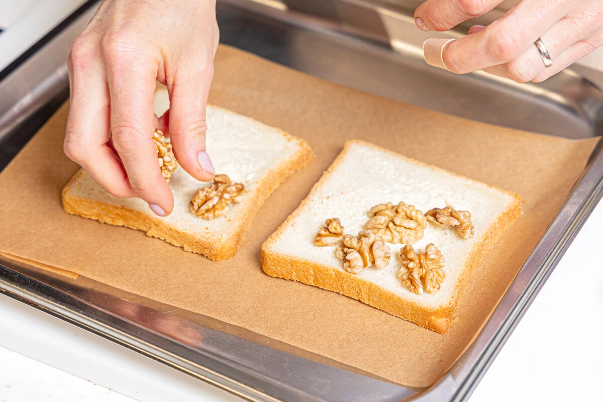 На застеленный пергаментом противень выложите ломтики бриоши. Слегка смажьте их сливочным маслом и выложите сверху грецкие орехи.