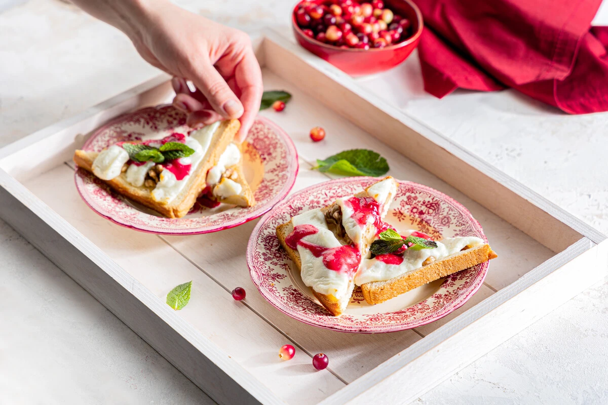 Горячие бутерброды с козьим сыром и клюквой не только разнообразят ваш завтрак или перекус. Они отлично подойдут и в качестве праздничного угощения.