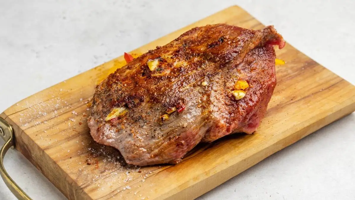 На сливочном масле обжарьте начинённую говядину со всех сторон. Оботрите обжаренное мясо смесью из соли, перца и аджики, заверните в фольгу и запекайте на 160 градусах с конвекцией 45 минут.